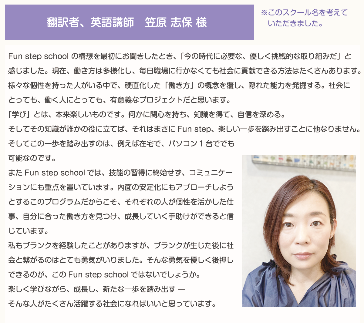 「Fun Step School」は家から出られない引きこもりの方が、「自分と向き合い自信を持ち、社会活動できる人材になる」ことを最初の目標にしています。本プロジェクトをご覧いただき、一人でも多くの方にご共感・ご支援いただければ幸甚です。