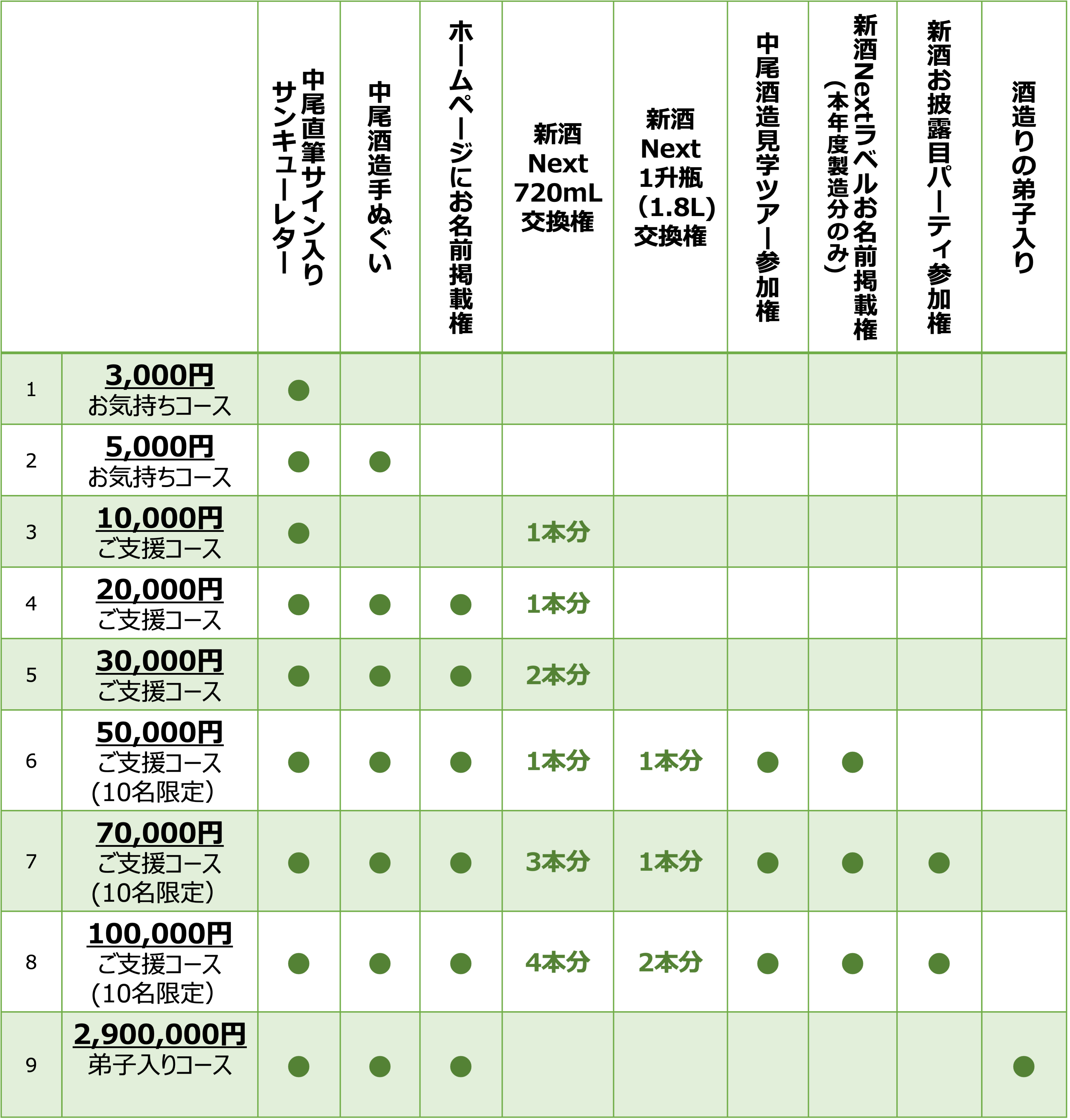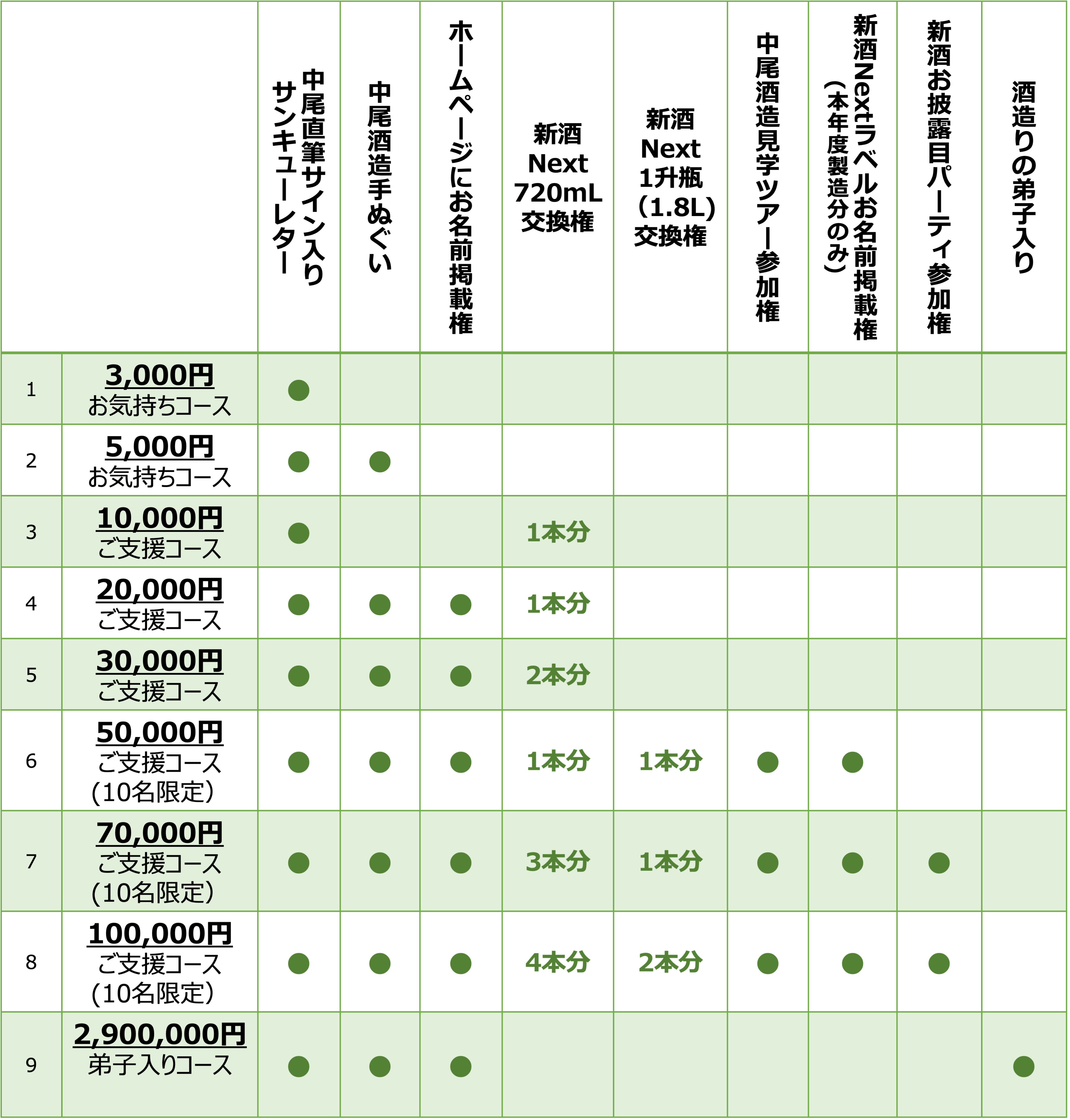今回リターンではお気持ちとしてご支援頂くコース、新酒Nextをご賞味頂けるコースを金額ごとにご準備しました。