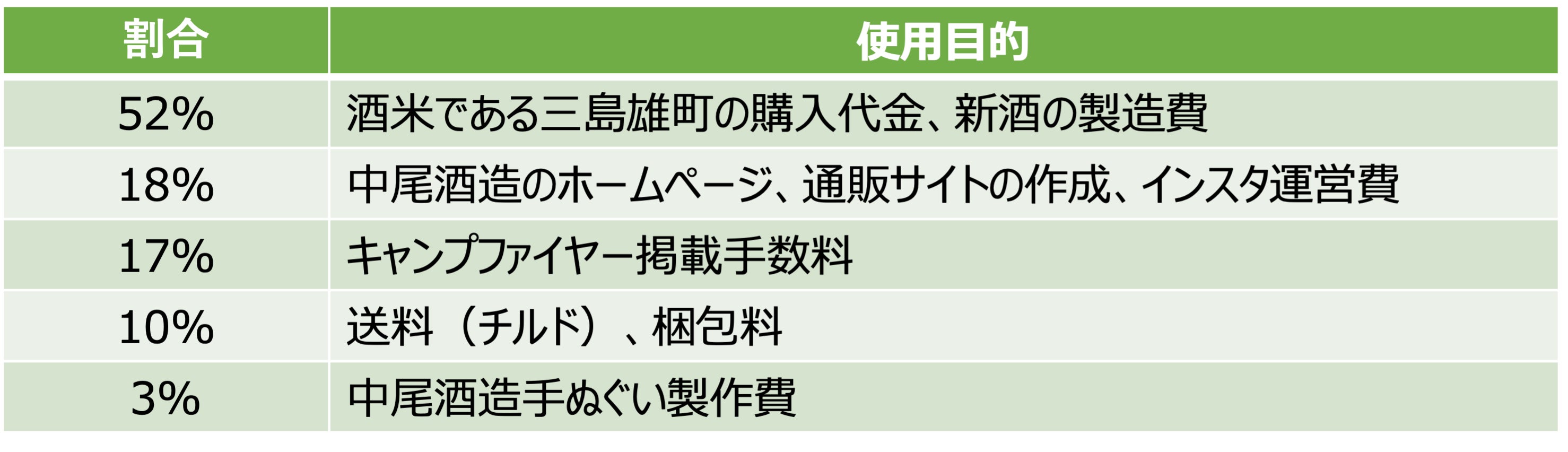 今後の酒米の購入と新酒の製造、恥ずかしながらこれまでなかった全国の方に購入頂くためのホームページ兼通販サイトの構築などに資金を充て、茨木市400年以上の歴史を誇る酒、奇跡の復刻米“三島雄町”で造った酒を1人でも多くの方に届けたいと思っています!