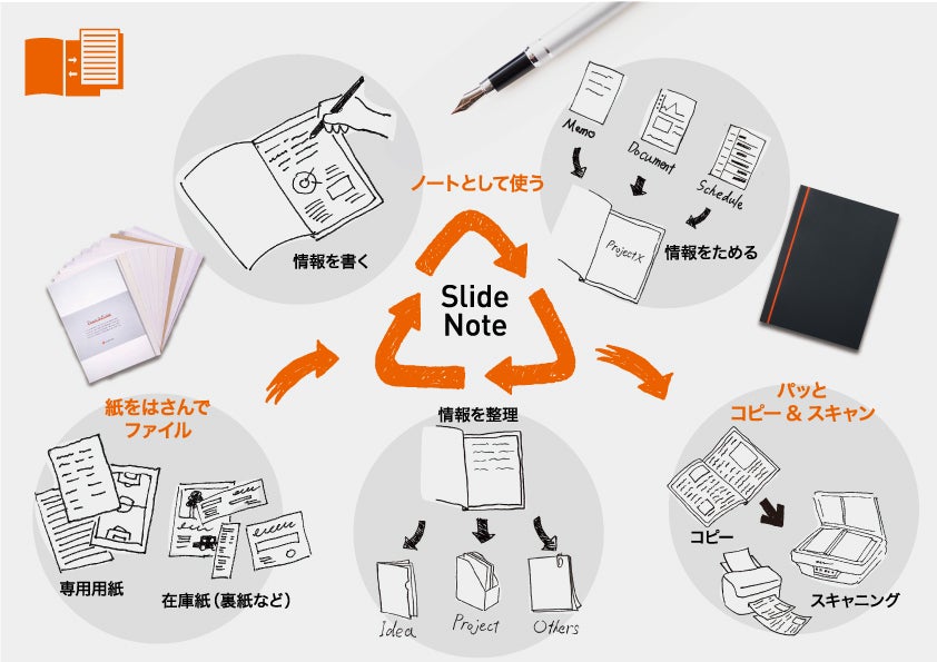 お好みの用紙やコピー用紙、裏紙、ルーズリーフ用紙など、あらゆる用紙をSlideNoteにセットすることで、これまでのノートのように使用することができます。フレームをスライドするだけで用紙が取り出せるため、コピーやスキャンも容易に行えます。