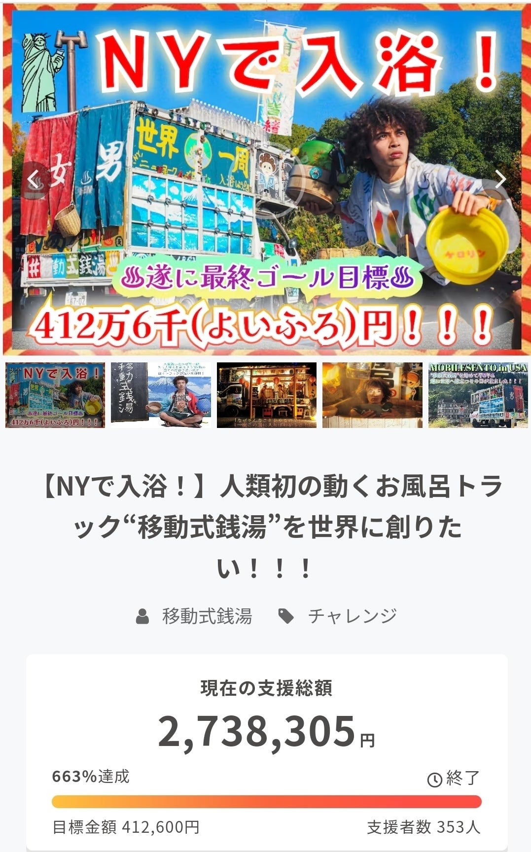 2023/06/19 00:522023年6月18日24時00分クラウドファンディング、無事に終了しました!総支援額2,738,305円総支援者数353名改めて今日まで応援して下さった皆様方には感謝しかございません本当に本当に、心からありがとうございました!ここからが真のスタートです皆さんの想いを受け取り、全力で夢を叶えてみせます!こんな自分ですが、これからもどうか宜しくお願いします!!NYで入浴、ぜったいに成し遂げてみせるぞ!!!2023.6.19移動式銭湯 三宅天真 もっと見る
