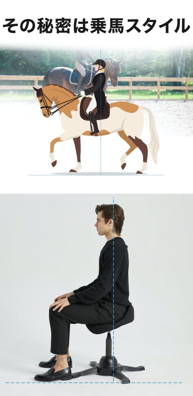 ホースライディングチェアは乗馬スタイルをとることで、腰を自然に支え、S字カーブの背骨にフィット。身体への負担を軽減し、座るだけで無理せず正しい姿勢をサポートします。