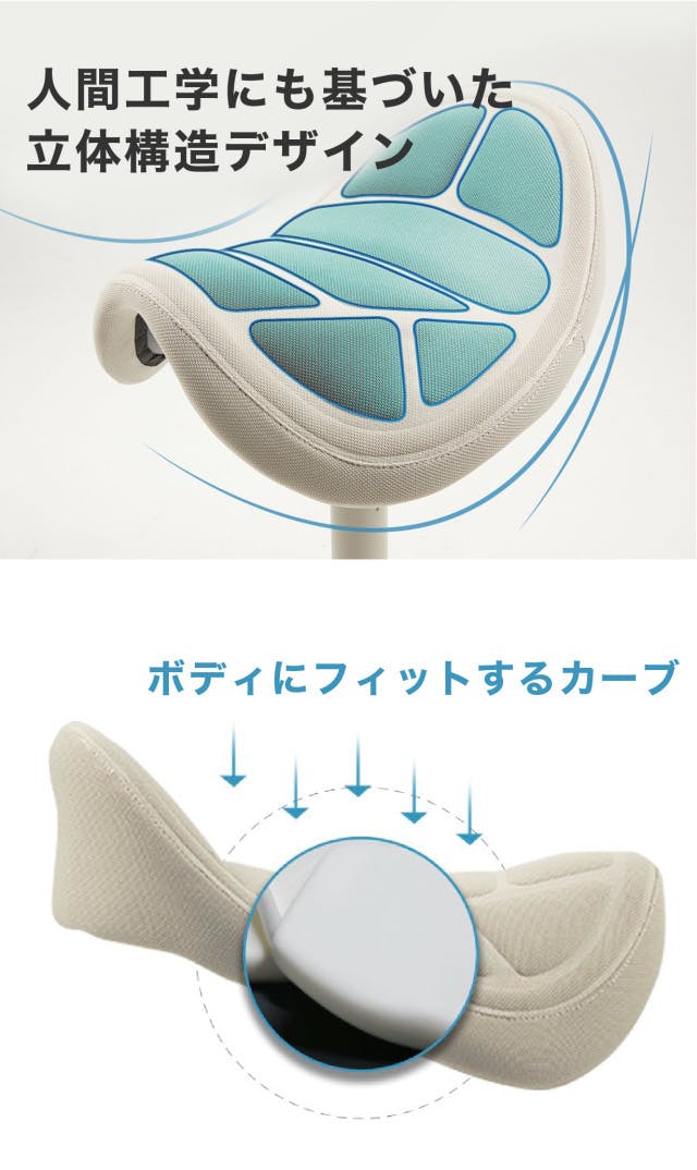 A1.ホースライディングチェアは乗馬スタイルが理想的な着座姿勢を取れるデザインで正しい姿勢の習慣化をサポート。S字カーブの背骨にフィットし、腰を支えるため、無理せず自然で良い姿勢をキープします。