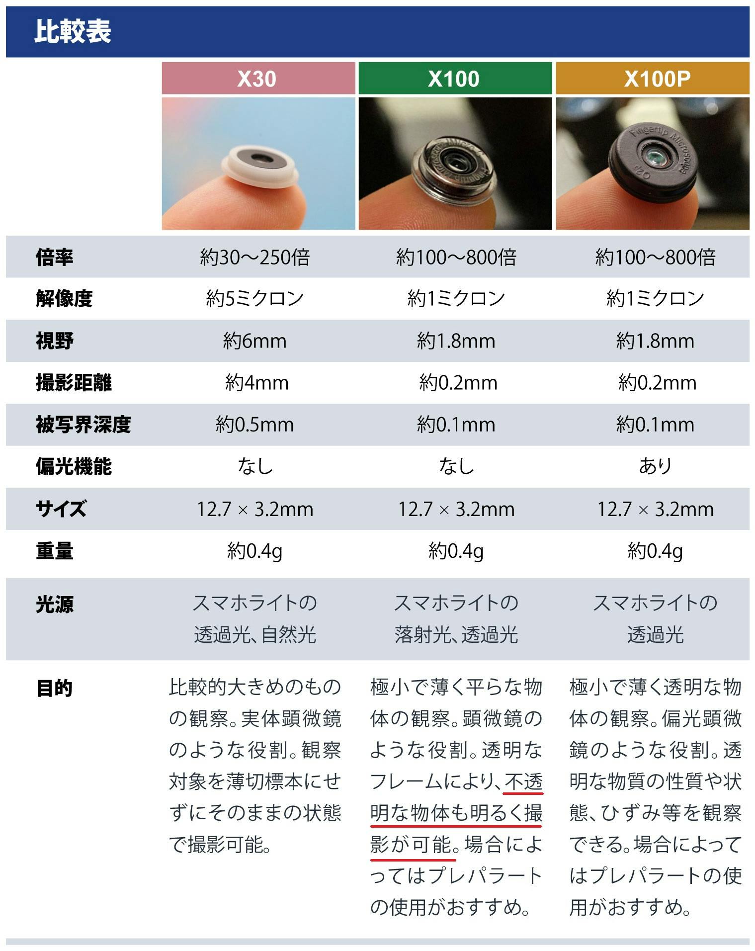 またmicroHunter X100は、観察対象がなるべく平らなものである必要があり、場合によってはプレパラートの使用をおすすめします。
