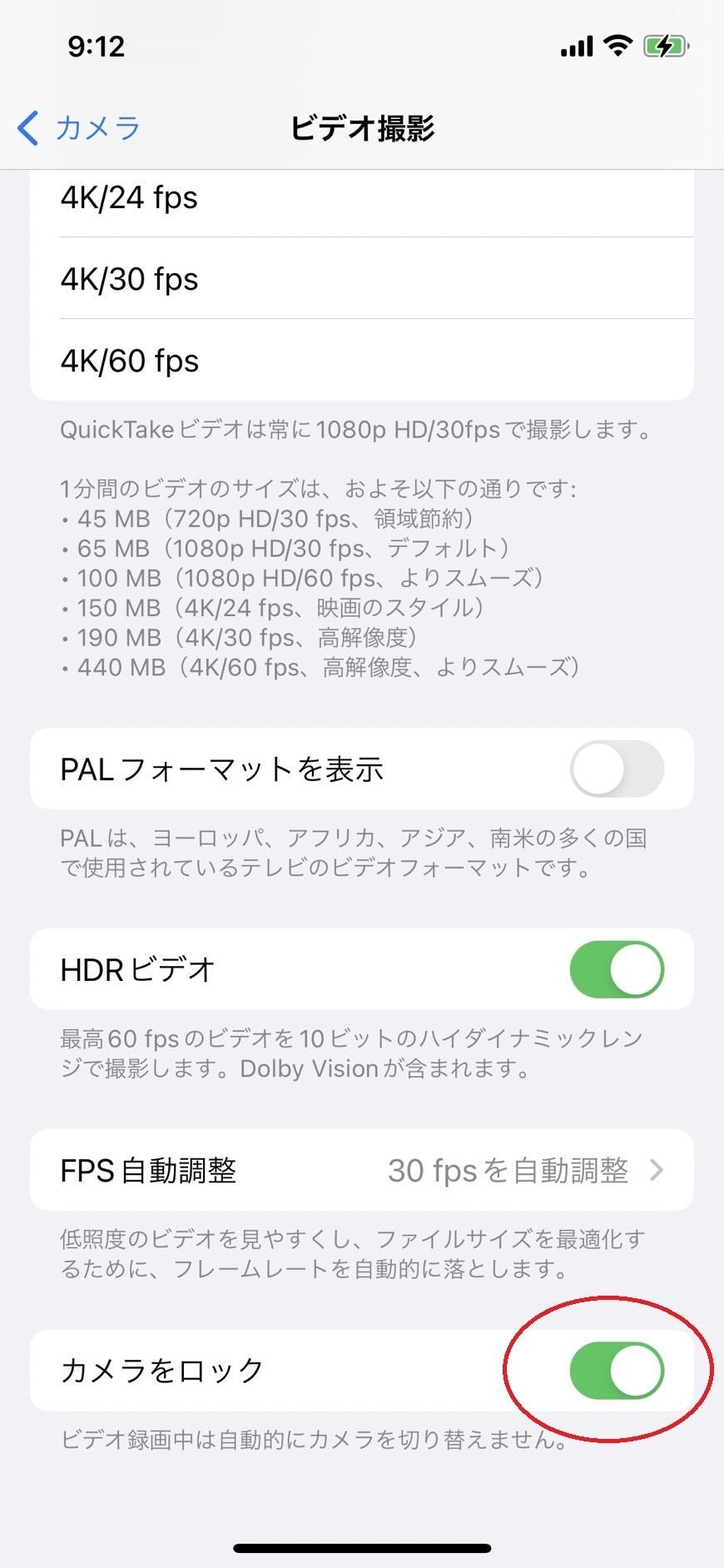 A. iPhoneの標準アプリは手動でカメラレンズを切り替える事ができません。自動でレンズが切り替わってしまう場合は、「常時フラッシュ点灯」「レンズの手動切り替え」ができるマニュアル機能に特化したカメラアプリを使用するか、下画像のように設定で「カメラをロック」をONにして動画で観察して下さい。