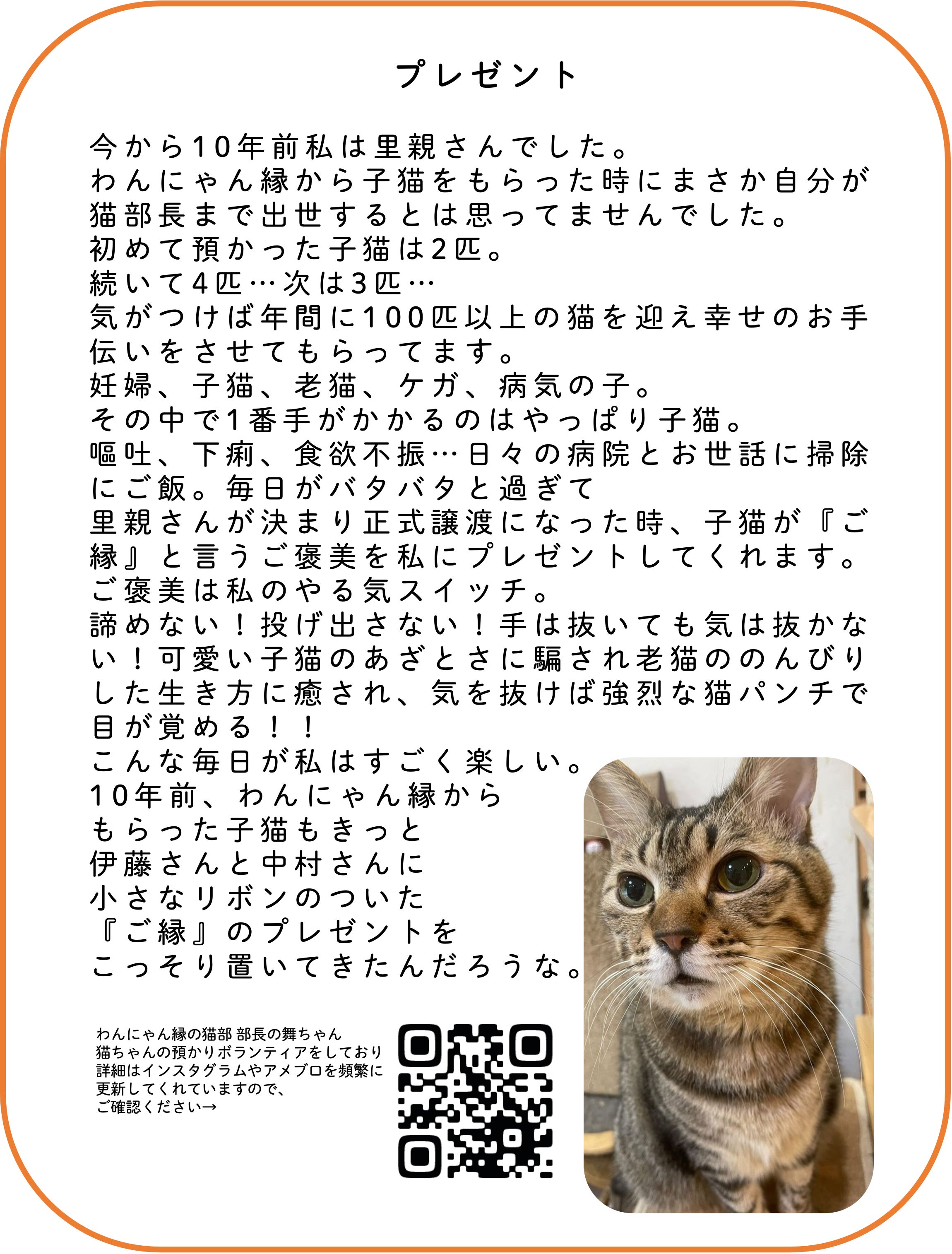 ・えにしより、感謝のメールをお送りさせて頂きます。メールには猫ちゃんの写真を2枚つけてお送りします。
