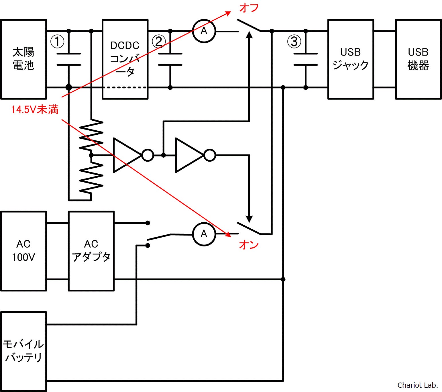 太陽電池からの入力が14.5V未満の場合、太陽電池からの系統をオフし、ACアダプタ/モバイルバッテリからの系統をオンします。 太陽電池からの入力が14.5V以上では、太陽電池からの系統をオンし、ACアダプタ/モバイルバッテリからの系統をオフするので太陽電池からUSB充電対象機器に充電します。 そのため、太陽電池だけではUSB充電対象機器への電力供給が十分でない場合は、太陽電池からの入力電圧が低下します。 そうすると、太陽電池からの入力が14.5V未満となり、太陽電池からの系統をオフし、ACアダプタ/モバイルバッテリからの系統をオンするので、ACアダプタ/モバイルバッテリからUSB充電対象機器へ充電します。 そうすると、太陽電池からの入力電圧が上昇します。 このフィードバックにより、協調充電モードでは、太陽電池からの電力供給を優先し、足りない分はACアダプタ/モバイルバッテリから電力供給し、太陽電池からの入力は常に14.5Vとなります。 厳密にいうと、14.5Vからほんの少しだけの変化はあります。