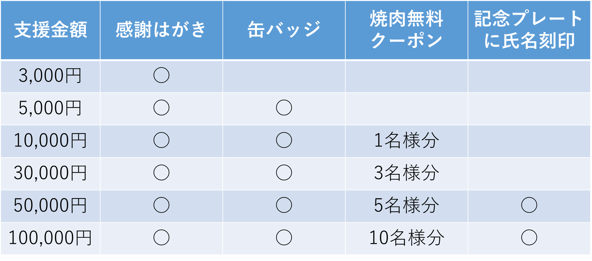 ご支援いただいた方にはささやかながらお礼をさせていただく予定となっています。リターンは「感謝はがき」と「缶バッジ」、「焼肉無料クーポン」、「記念プレートに氏名刻印」があり、支援金額によってお礼の内容が異なります。今回の目玉リターンである「缶バッジ」と「焼肉無料クーポン」については「活動報告」にて紹介させていただきました。リンクをご参照ください。