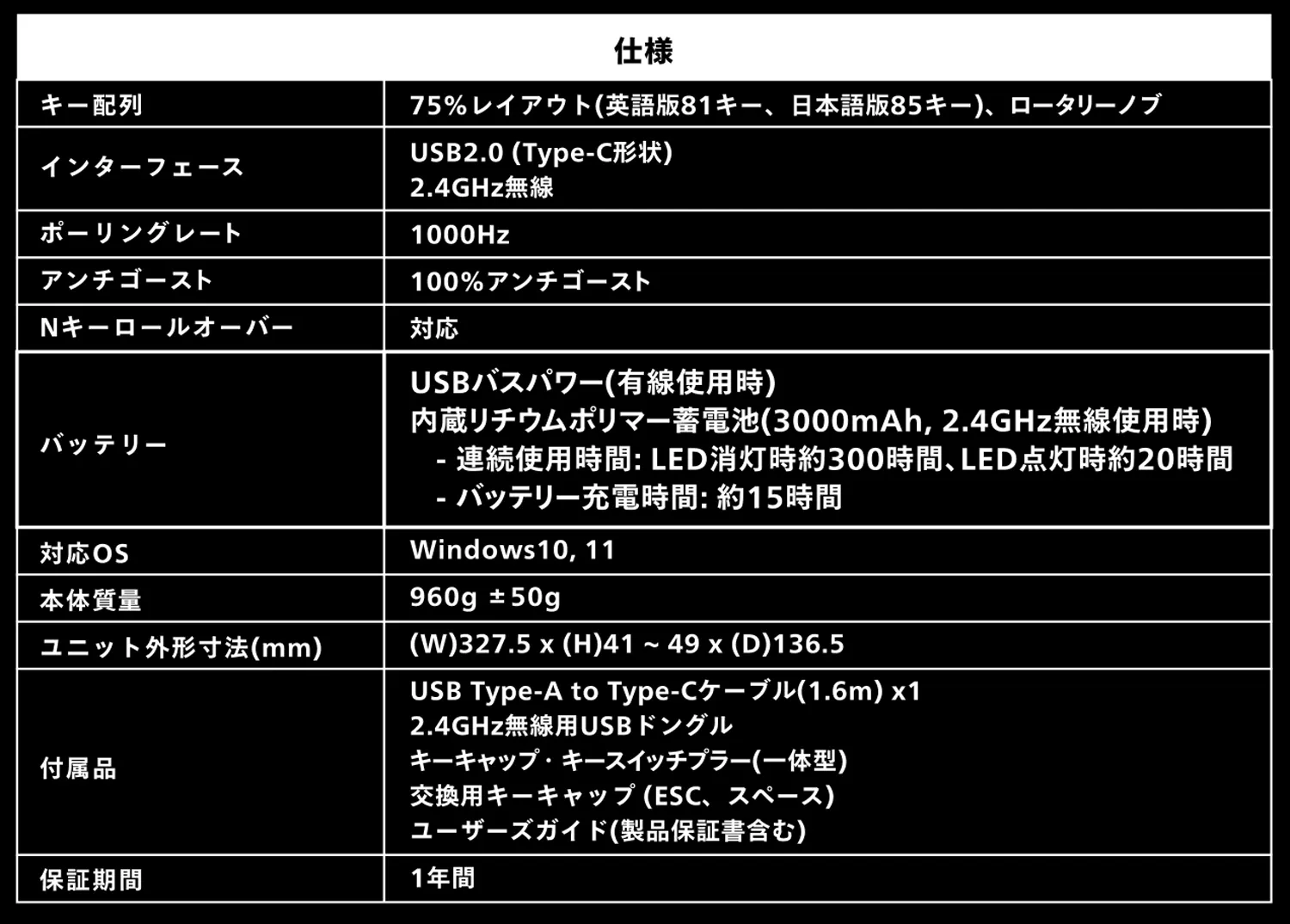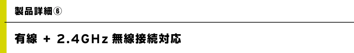 ケーブル脱着可能なUSB Type-C(USB2.0)の有線接続に加え、2.4GHz無線接続にも対応。