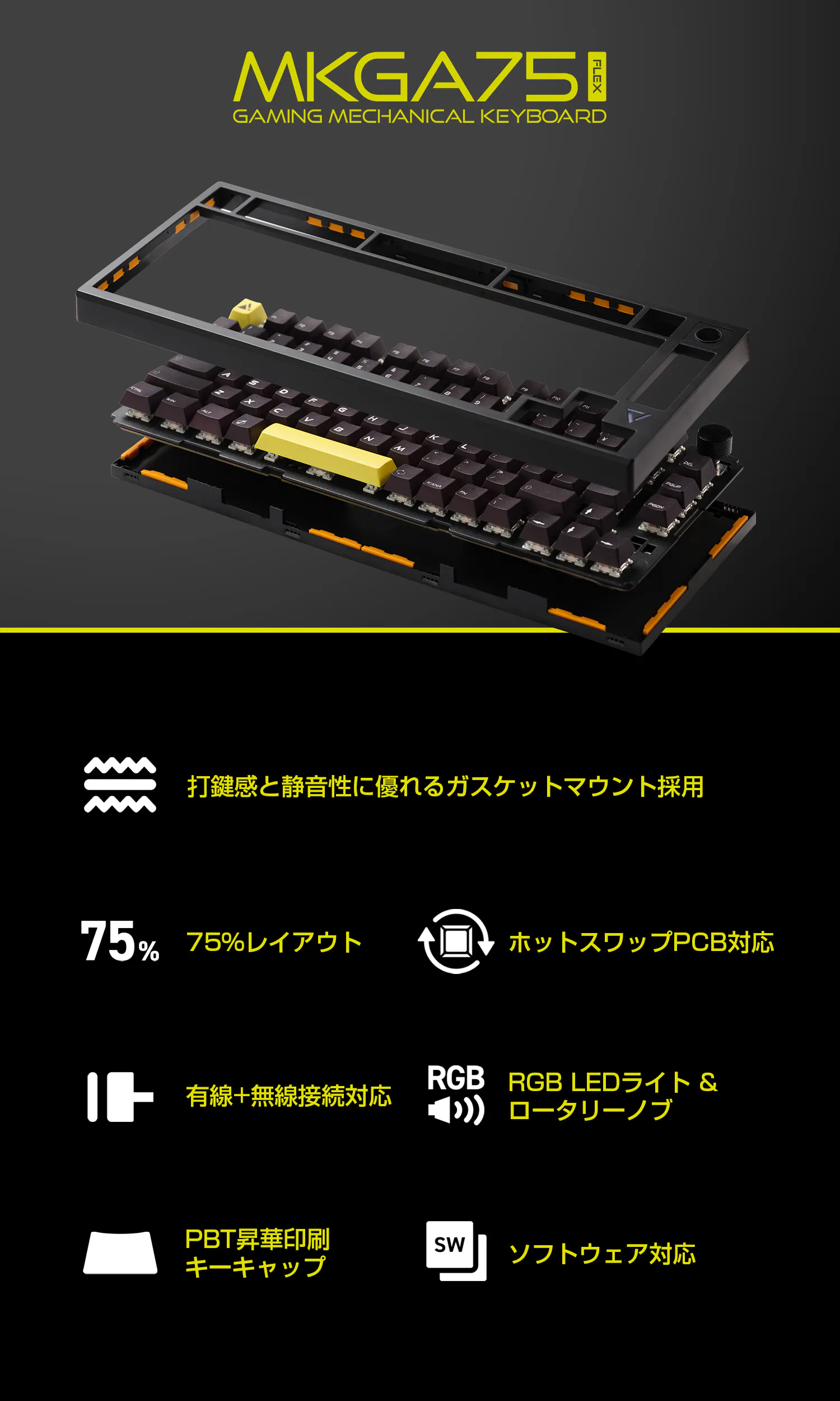 UP-MKGA75シリーズは、キーボード=入力機器の原点に立ち返り、 心地の良い打鍵感に拘り、ゲームプレイ時に安定したパフォーマンス向上を得られるような製品を目指しました。 最新のトレンドを盛り込んだスペックを採用し、ケース構造、キースイッチ、キーキャップが三位一体となって 至高の打ち心地を実現します。 また、75%レイアウトでありながら日本語配列バージョンも展開。 カスタマイズ製も備えており、初めてのメカニカルキーボードにも、 2台目以降のお客様にも満足いただける内容となっています。