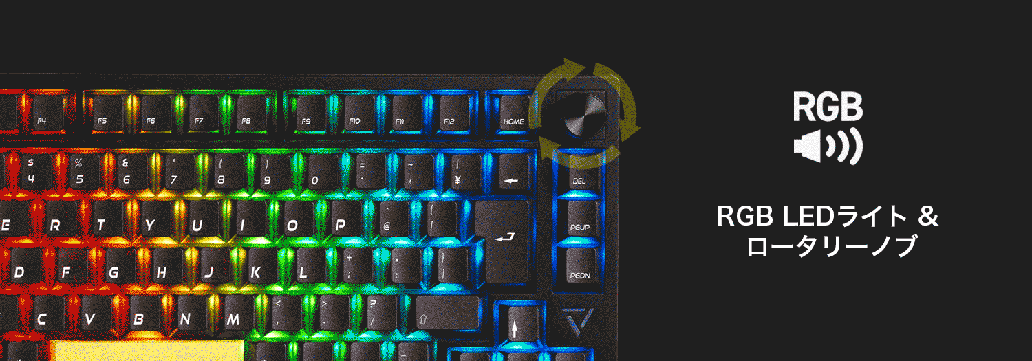 ソフトウェアで光り方のパターンが楽しめるRGB LEDライトに加え、音量調節可能な高級感のあるアルミ削り出しのノブを装備。ESCとスペースキーは黒色のキーキャップへも交換可能(付属品)、主張が控えめのブラック一色にすることもでき、ゲーム部屋やオフィスなど、様々な環境で使用できる外観です。