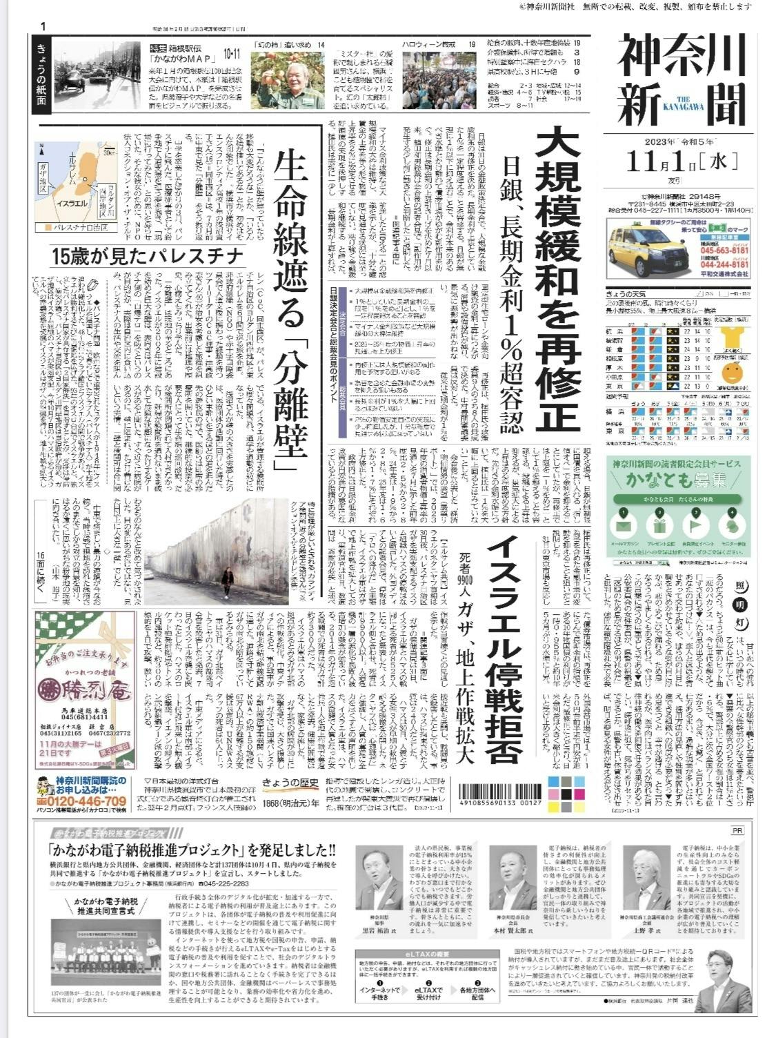 2023/11/01 12:383月にパレスチナに渡航した貴子さんが、本日の神奈川新聞に掲載されました。渡航当時は、パレスチナ・ヨルダン川西岸地区や東エルサレムは、海外渡航安全情報でもレベル1、十分安全に注意して渡航してください。つまり、インドやフィリピンなどと同レベル。銃による紛争ではなく、イスラエルにパレスチナの土地が奪われ、壁が作られるが主の紛争が行われていました。半年後、同じパレスチナ自治区内のガザ地区を中心にこのような事態になるとは、本当に悲しいです。だれよりもショックを受け、そして何か行動を起こそう、と今躍起になっているのは、実際にパレスチナに渡航した貴子さん。彼女の想いが今日、神奈川新聞に大きく掲載されたのでお知らせします。ぜひコンビニ等で手に取っていただければと思います。彼女がパレスチナで何を感じたのか、そもそもパレスチナ・イスラエル紛争とはなんなのか、平和の価値とはなんなのか。詳しく知りたい方は、10月26日発売の、貴子さん、そして私たちCoCの想いが詰まった書籍「15歳の少女が見た紛争地「パレスチナ」の未来をぜひ読んでみてください。購入は以下のURLからどうぞ。https://coc-i.stores.jp/items/653791274b9bca002fbfc5de もっと見る