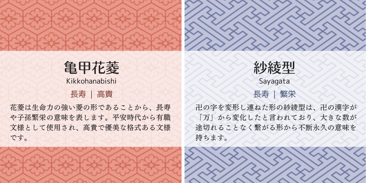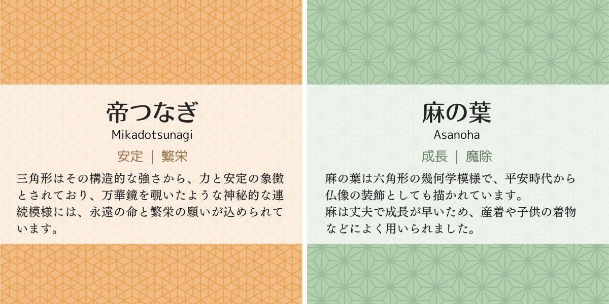 □四角と△三角の二つの形と、亀甲花菱、麻の葉、紗綾型の三つの柄を組み合わせてお選びいただけます。