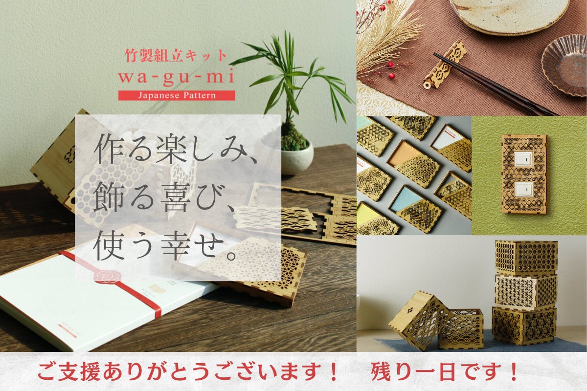 2023/01/24 10:20皆様、この度はご支援いただきありがとうございます!wa-gu-miクラウドファンディングプロジェクトも残り一週間となりました。https://camp-fire.jp/projects/view/637986限定の名入れは勿論、大変お得に購入できる最後のチャンスとなっております。各種 超早割⇒定価より20%OFF各種 早割⇒定価より10%OFF竹製ならではの、高級感とぬくもり、手に取ったときの香りと感触、そして最新のレーザーカット技術により表現された日本古来の文様である和柄の美しさを、ご支援いただいている皆様にお届けできること、大変嬉しく思います。是非、ご知人やSNS等でシェアして頂けると幸いです。ラスト一週間、wa-gu-miプロジェクトの更なる発展に努めて参ります。引き続きよろしくお願いいたします! もっと見る