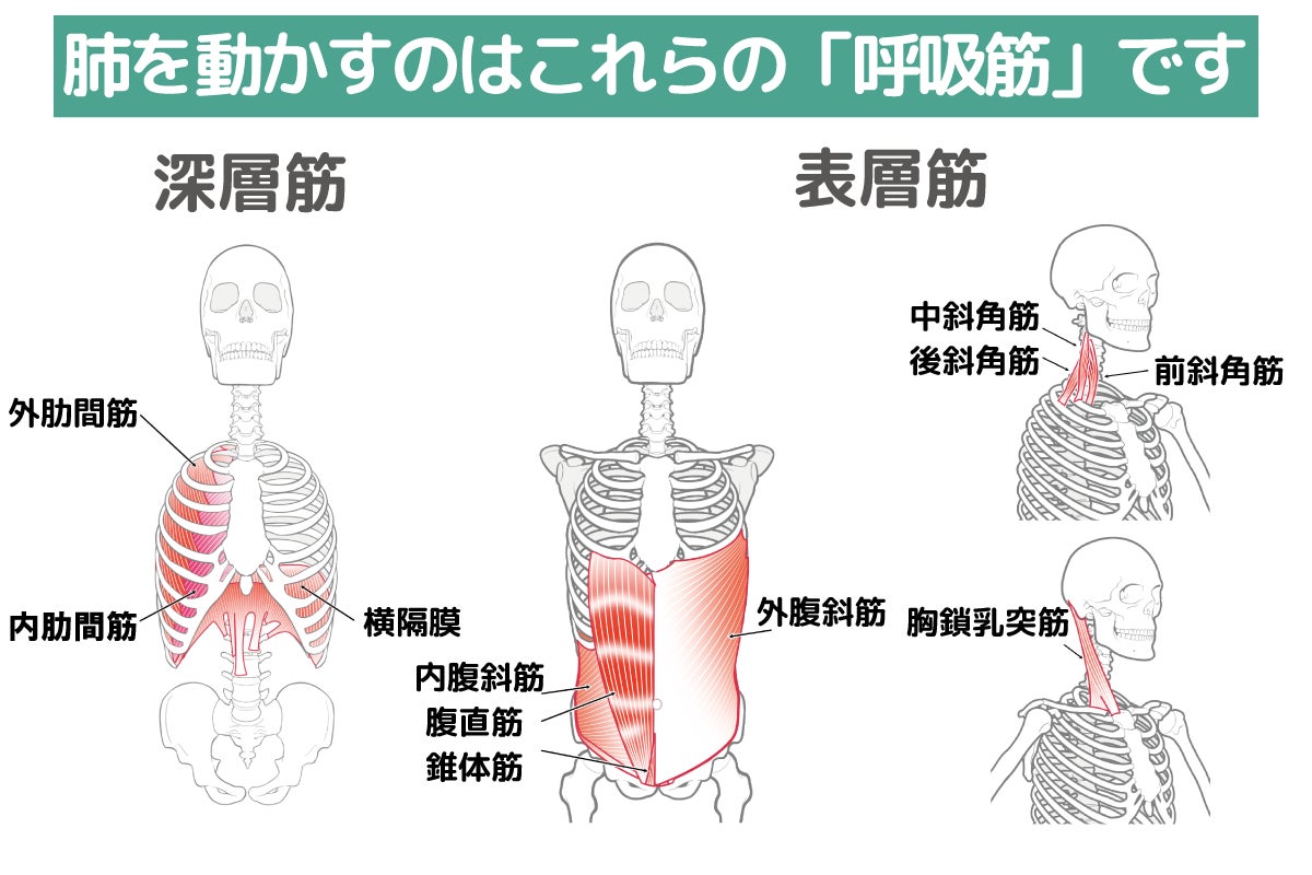 良く知られているのは横隔膜や腹直筋ですが、それ以外にも様々な筋肉が肺の動きに関係し、これらの筋肉の総称が「呼吸筋」です。