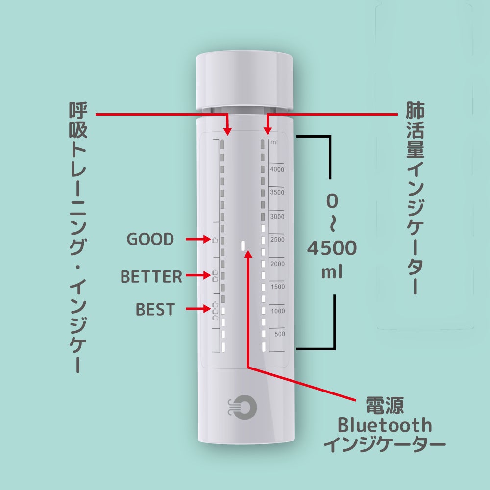 ⑤肺活量、及び現在吐いている(或いは吸っている)息の量は本体側面にあるインジケーターに表示されます。「BEST」までLEDランプが上昇ように頑張って呼吸してください。
