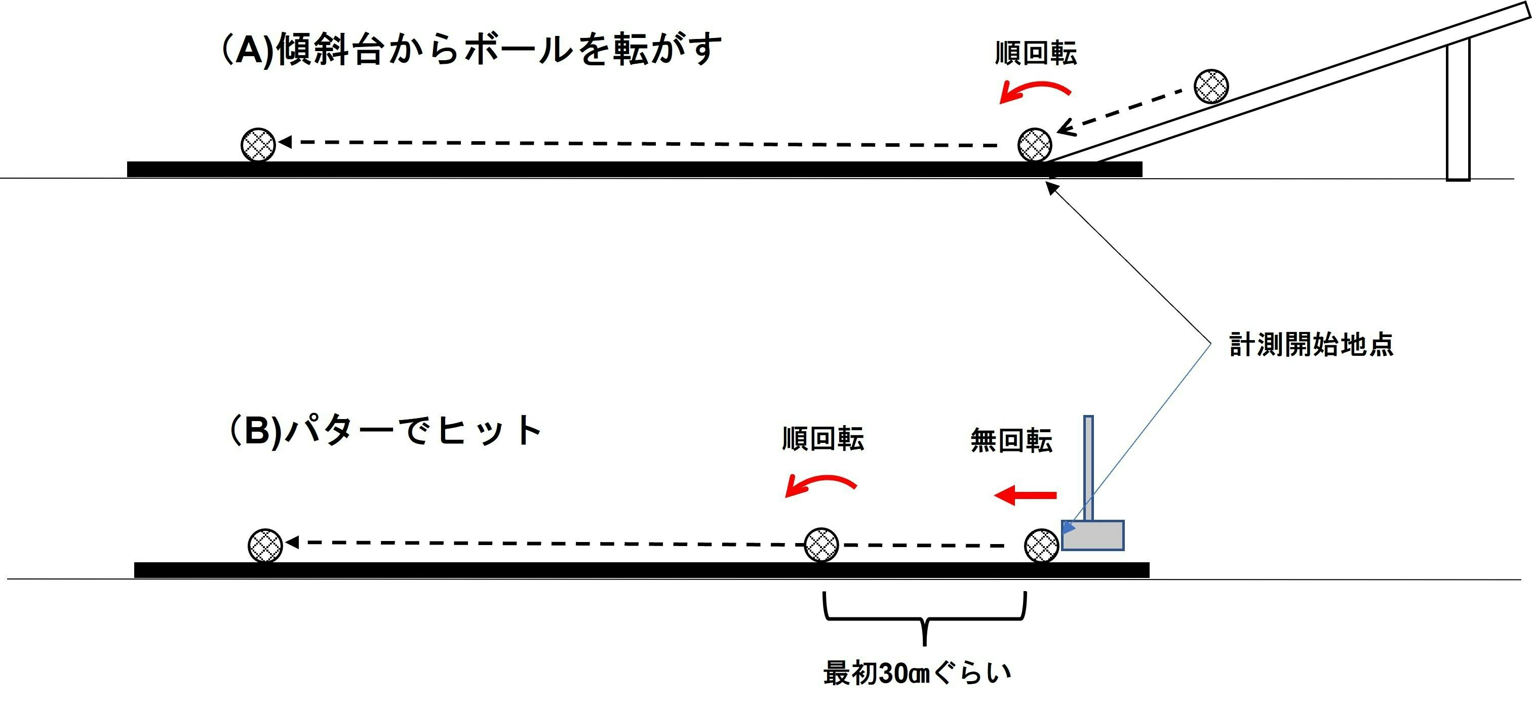 2022/12/14 10:134mのポイント(距離確認位置)までボールを打つと実際の距離より遠く打つ感じがするのは事実です。 以前の活動報告にも記載しましたが、リターンしたボールの転がる距離は傾斜台からボールを転がして決めていますので、図(A)に示すように、計測開始地点からボールの順回転は始まります。しかし、実際にパターでボールをヒットした場合、図(B)に示すようにパターの芯にボールの芯が当たれば最初は「無回転状態」となり、無回転(滑る動き)で最初の30 ㎝ぐらい出ていった後に順回転変わっていく感じになります。 実際にパターで打つ時より傾斜台からボールを転がした時の方がすぐに順回転の安定した転がりになるため、よく言われる「横回転で球がブレずに、真っすぐに転がっていく球筋になるような回転」の『最後のひと転がり』と『伸びる球』になり、更に、パターでヒットした直後の30㎝ぐらいを滑らす力もプラスして必要になると思われます。 このように、リターンの停止ポイントは実際より距離が長い感じになると思いますし、更に、距離が長いほどボールの伸びが関係してきますので、現時点では最高のパッティングができた時に4mの距離確認位置に到達できる、と考えて頂ければと思います。また、ダッシュボードの本文にも記載してあるように、湿度によってボールの転がる距離は大きく違いますので、この点を踏まえ距離感を養って頂ければと思います。 Never up never in、しっかりとしたパッティング技術を身につけると同時に、メンタル面を鍛えることが重要です。30㎝ぐらいオーバーする気持ちで打つと良いともいいますから、多少強めのパッティングを習得すると考えてみては如何でしょうか。なお、このご意見を基にポイント(距離確認位置) は茣蓙の範囲±5%で見直しを行い、感覚的により実践近くしたいと思います。 もっと見る