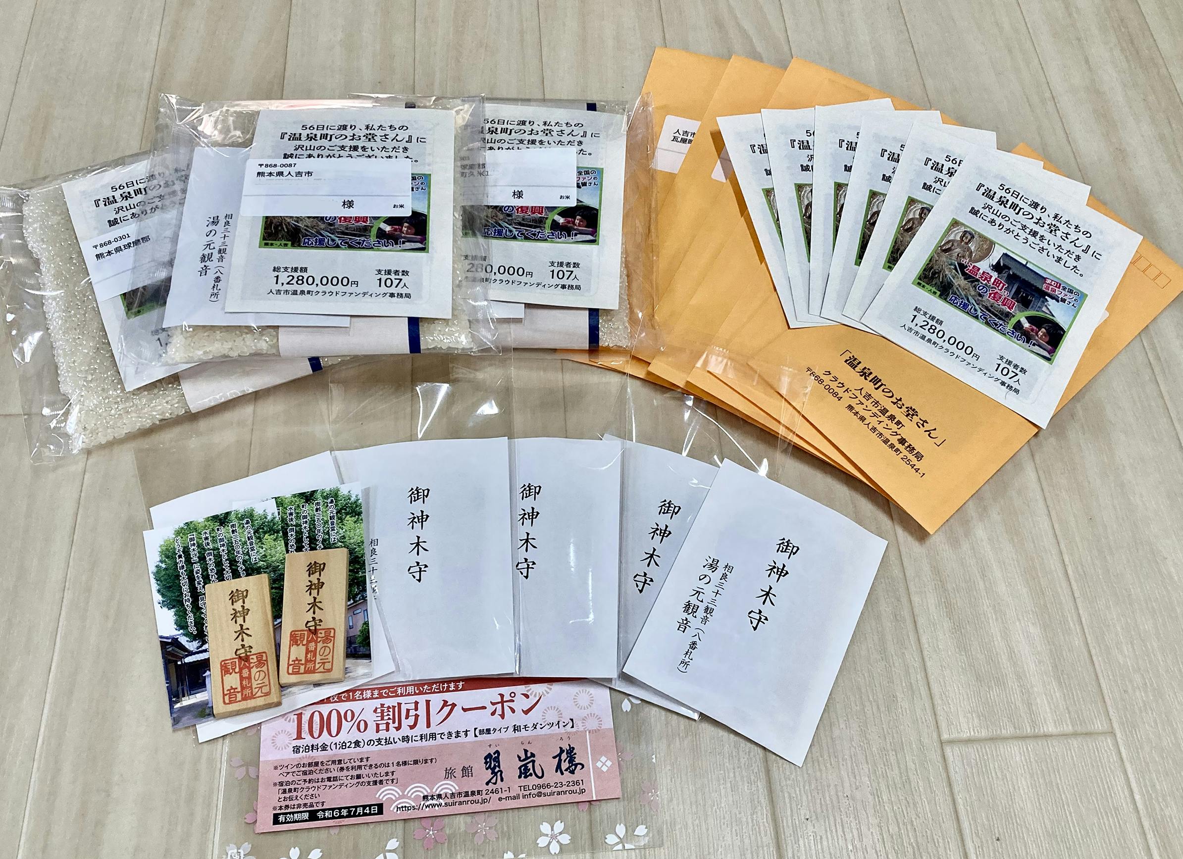 2023/05/27 17:53こんにちは。皆様いかがお過ごしでしょうか。おかげさまで、人吉市温泉町のクラウドファンディングは皆様方からあたたかいご支援をいただき、目標額およびセカンドゴールを達成し、終了することができました。これもひとえに、応援してくださった全国の皆様のおかげです。温泉町町内会一同、心から感謝申し上げます。さて、先日リターン品を発送いたしました。お手元に届いておりますでしょうか?何か手違いや不備など、お気になられることがございましたら、温泉町のクラウドファンディングページの、「メッセージを送る」からお問い合わせいただけますと幸いです。なお、【35,000円コース】【80,000円コース】を選択いただいた方の「お名前札奉納」につきましては、湯の神神社の復旧工事の完了が後ろ倒しになっている関係で、遅れが生じております。該当される皆様には、奉納の際に改めてご報告をさせていただきますので、ご理解いただけますよう何卒よろしくお願い申し上げます。改めまして、皆様のご支援に感謝いたします。温泉町にお越しの際は、ぜひお堂さんにお立ち寄りくださいませ。 もっと見るネクストゴールに挑戦します!