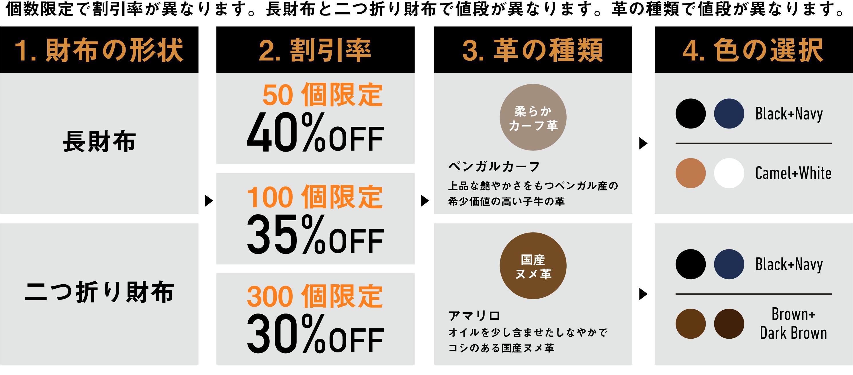 形状(長財布or二つ折り財布)と割引率、革の種類のサムネイルを選択してください。