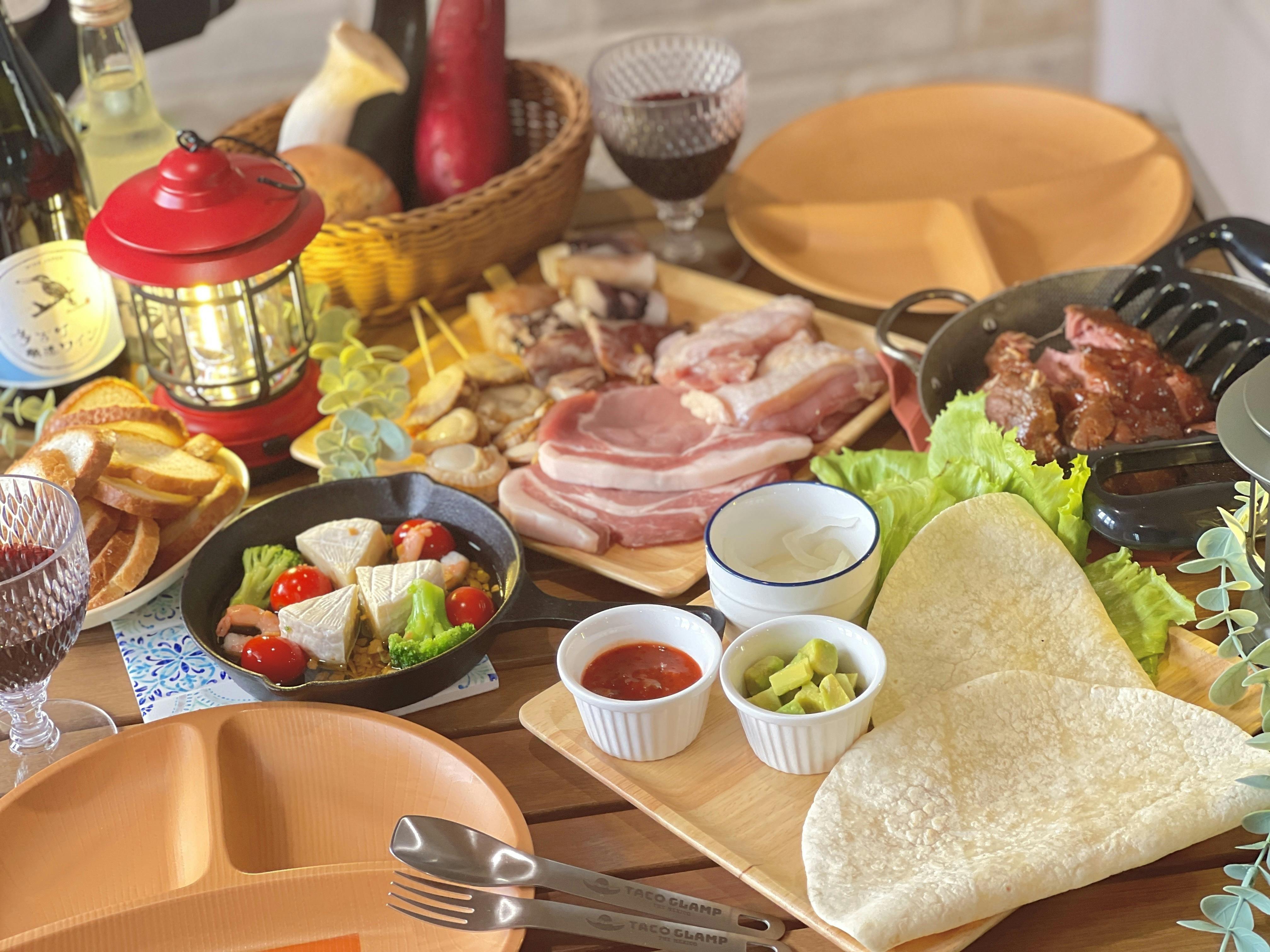 元気豚肩ロース、タコス、プルドポーク、チキンステーキ、海鮮串2種(イカ、ホタテ)、季節の焼き野菜、カマンベールアヒージョ、ラスクパン、各種調味料など