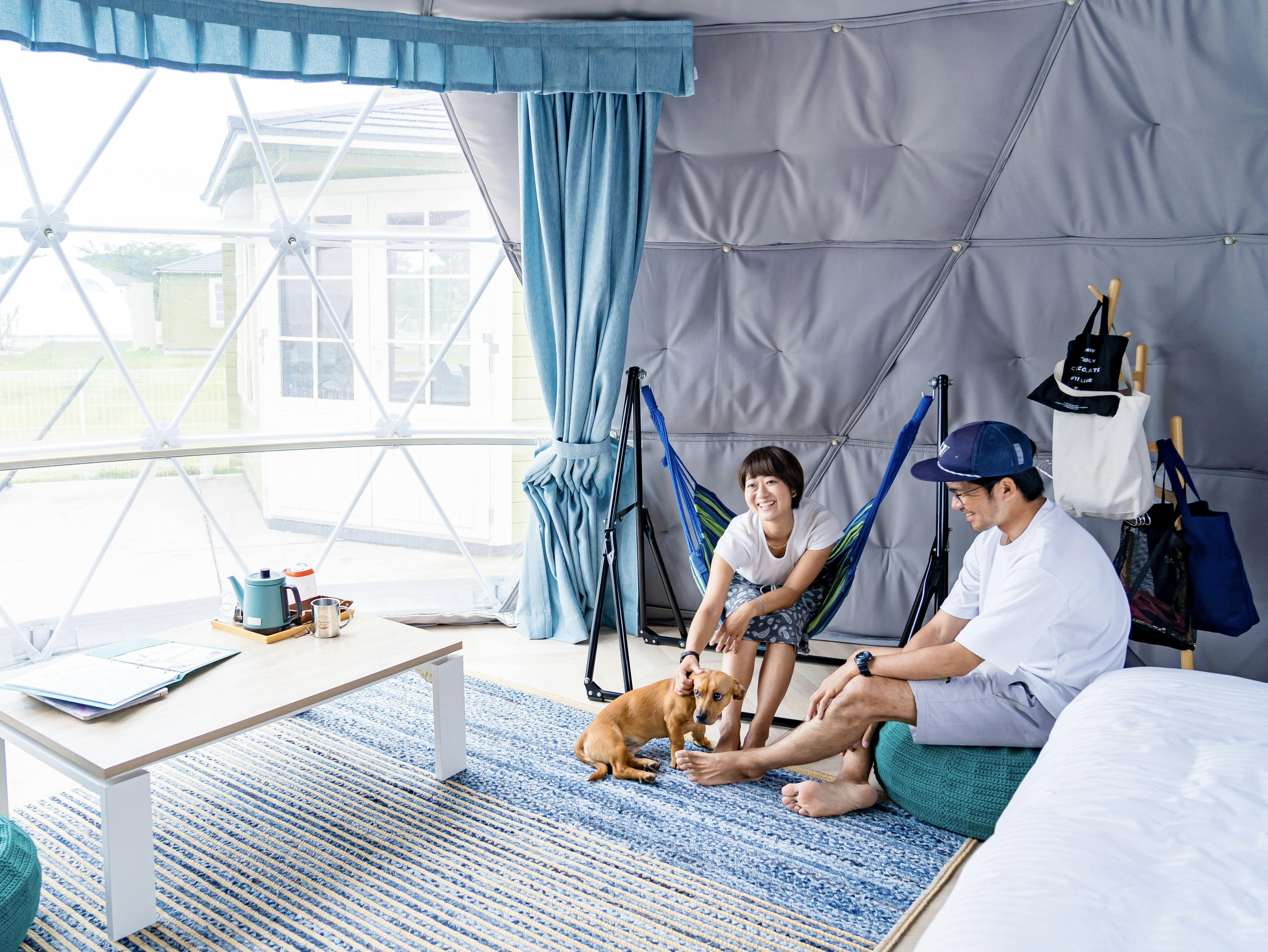 ペットとのご宿泊は「トレーラーハウス」か「ドームテント」となります。ご一緒のペットがのびのびできるように、ペットサイトは広々とした空間と柵を準備しています。