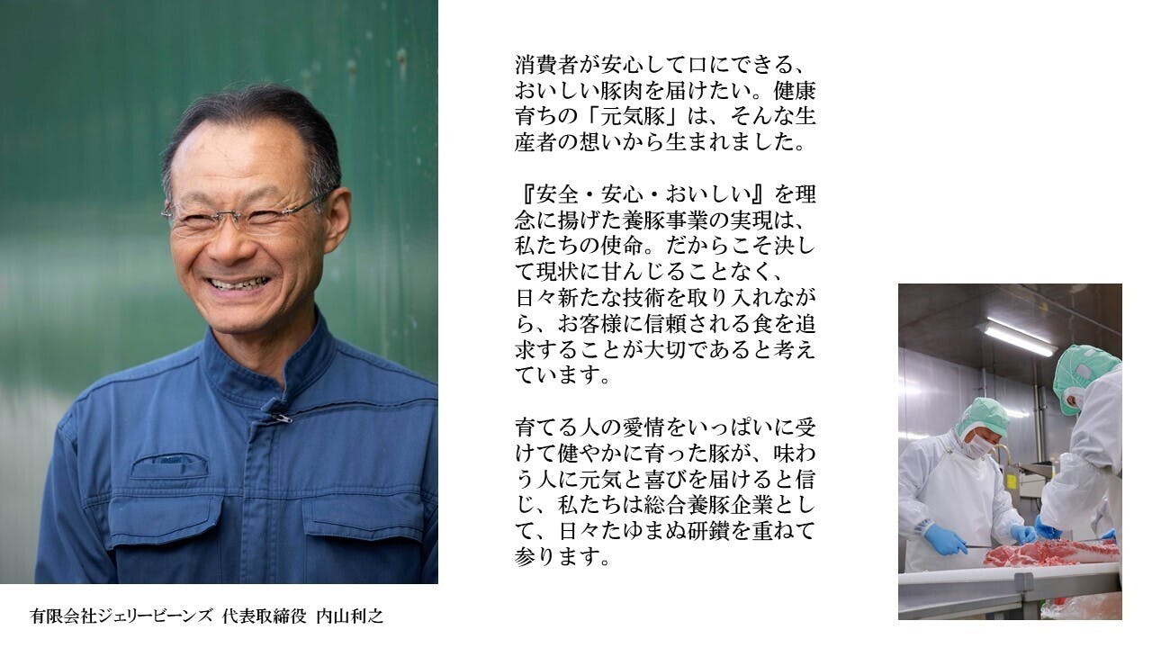 血統、飼育方法、飼料の3つにこだわり、豚が健康に育つ条件を整え、基準を満たしたもののみを『元気豚』として出荷しています。