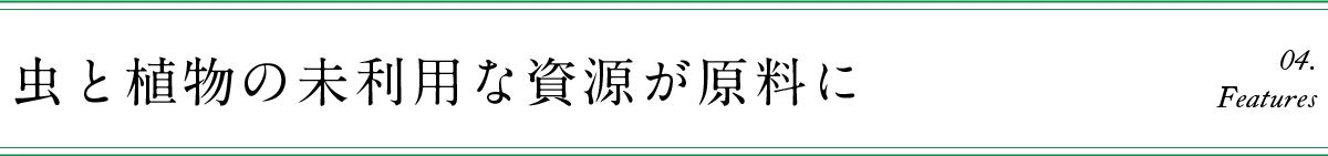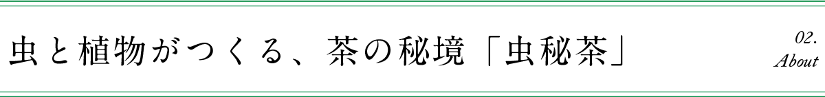 虫秘茶を生態学の言葉で表現すると、植物と昆虫の相互作用の賜物と言えます。植物は昆虫に食べられないよう、渋みや苦みを持ちます。一方で昆虫はそれらを克服して植物を食べられるように進化してきました。この渋みや苦みに代表されるような植物成分が、虫秘茶の風味のもととなります。フレッシュな状態では苦くて到底食べられない植物の葉も、昆虫の体内を通ることで、苦みも渋みも感じないほどに姿を変え、驚くほどに香り高く味わい深くなるのです。