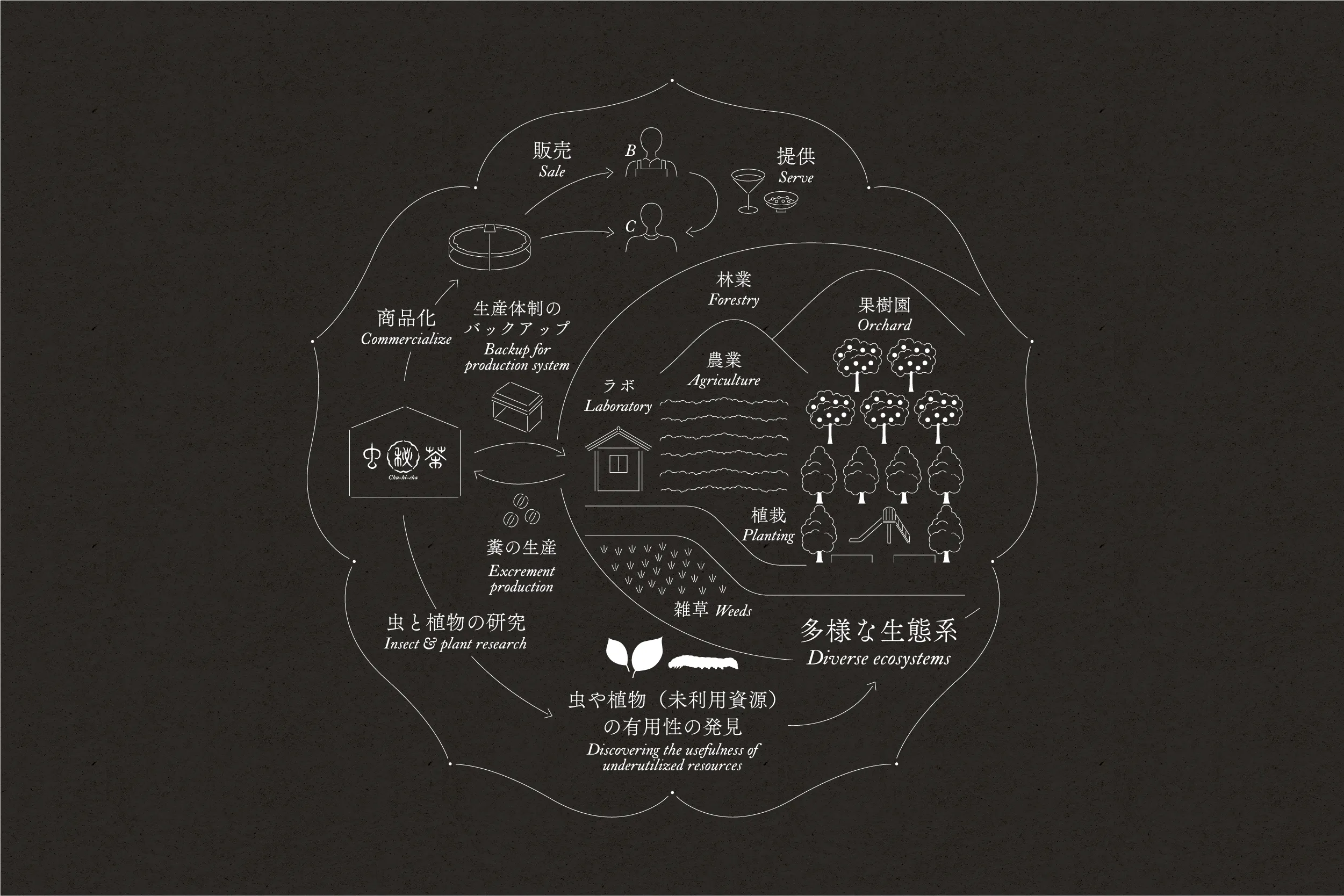 虫秘茶は「多様な植物」と「多様な昆虫」の掛け合わせで生み出されます。一説には地球上に植物は27万種、昆虫は蛾の仲間だけで16万種いると言われており、これらの多様性を資源として捉えたとき、ほとんどが「未利用な資源」です。特に、多様で独創的な機能を持つ昆虫は未開の宝庫と言えます。そんな、人類が見過ごしてきた自然には驚くような魅力や機能が秘められているはずです。虫秘茶には、そうした自然のポテンシャルを掘り起こす力があります。時には雑草とされる植物や、厄介者と呼ばれる蛾の幼虫の掛け合わせからも、驚くほどに味わい深い虫秘茶が生まれます。そんな嫌われ、疎まれてきた生き物たちにもスポットを当て、魅力を引き出すことができるのが虫秘茶の面白さであり醍醐味です。昆虫や植物の多様性を虫秘茶として表現することで自然の新たな活用を模索し、それがまわりまわって人間社会の持続・発展に繋がると信じています。