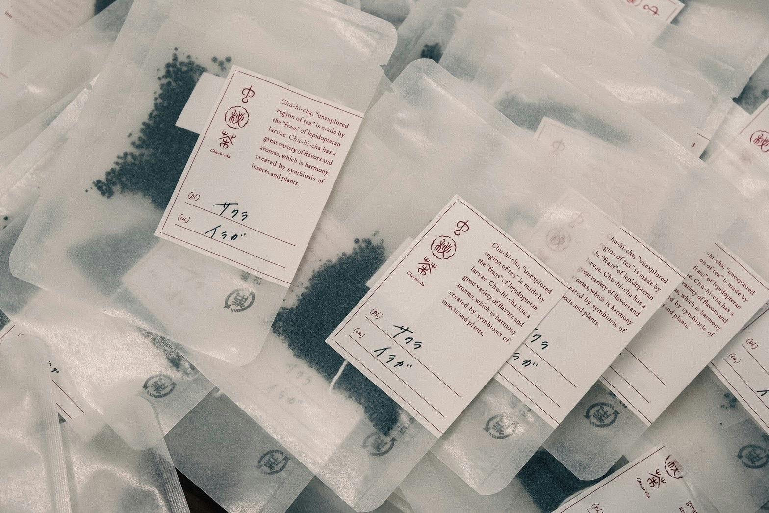 そう考えた私は翌日から色々な虫と植物を探しまわりました。日々、様々な虫と植物を採集し、沢山の種類の糞を集めました。虫と植物が変われば味と香りが劇的に変わることを発見し、格別に美味しいものもあればイマイチなものも多くありました。この試行錯誤のなかで見つけたとっておきのお茶を「虫秘茶」と名付け、もっと世の中に広げたいと考え始めたのがこのプロダクトのきっかけです。