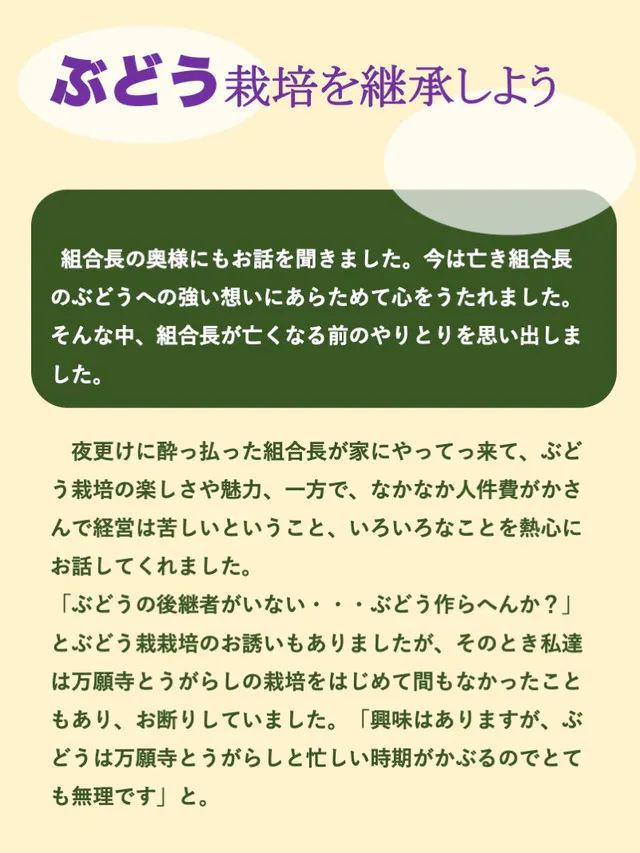 2023/02/26 21:11こんにちは。 みなさまのあたたかいご支援をいただきまして、総支援者数100人を達成することができました!ほんとうにありがとうございます。 一人でも多くの方にこのぶどうを通じて心を繋げてもらえたらと思っております^^ 1か月にわたるこのプロジェクトも残り51時間となりました。こんな農家がいる、こんな思いで作られた商品があると友人、知人の方々に拡散してくださると幸いです!!! お力添えよろしくお願いいたします。 もっと見る