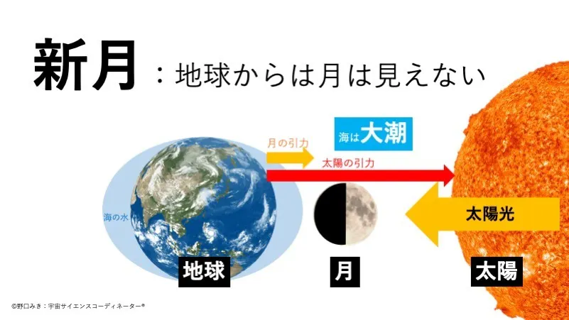 - 新月とは太陽から見て、太陽→月→地球の順番に並 んでいる状態です。 別名、朔月(さくげつ)とも言われます。