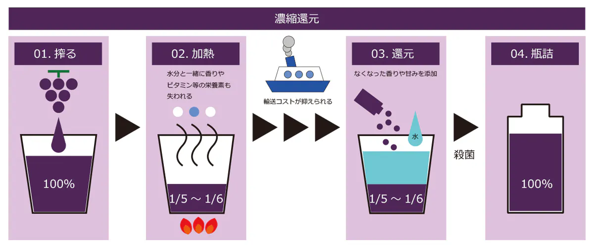 果汁100%ジュースと言っても大きく2種類あります。濃縮還元とストレートです。濃縮還元は、果汁を長時間加熱し水分を飛ばして濃縮したものに再度水分を戻す製法です。体積が5から6分の1になるので輸送コストを抑えられますが、果実の香りや風味、ビタミンなどの栄養素は失われます。