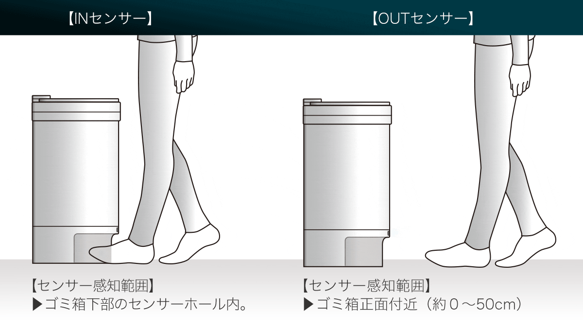 2つのセンサーを搭載しそれぞれ異なる感知方式にすることで様々な生活スタイルや使用環境に対応が可能となりました。「OUTセンター」は、赤外線をゴミ箱から約50cm先まで照射し近づく人を瞬時に感知します。「INセンサー」はセンサーホール内に照射される赤外線を足で遮断する事で感知します。