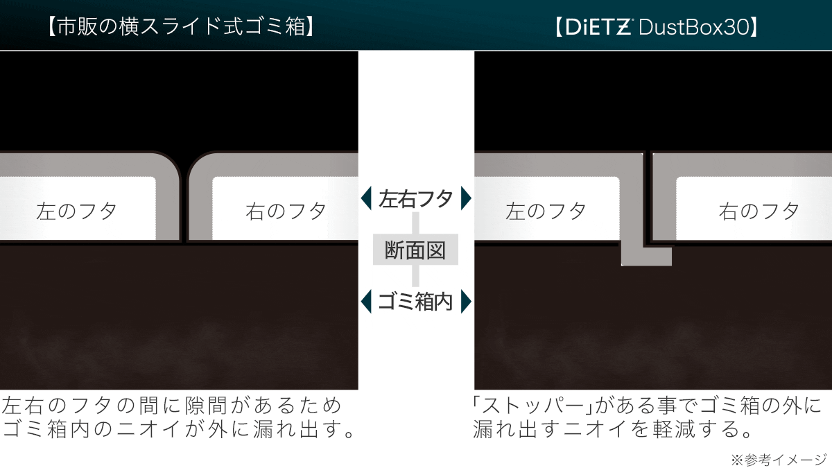 現在市販されているゴミ箱を含め、横スライド式のフタは閉じている時は左右のフタ扉の間に隙間が生じてしまいます。 これは肉眼だと分かりづらいほどの隙間ですが、そこからゴミ箱内のニオイが漏れ出すという事が懸念されていました。