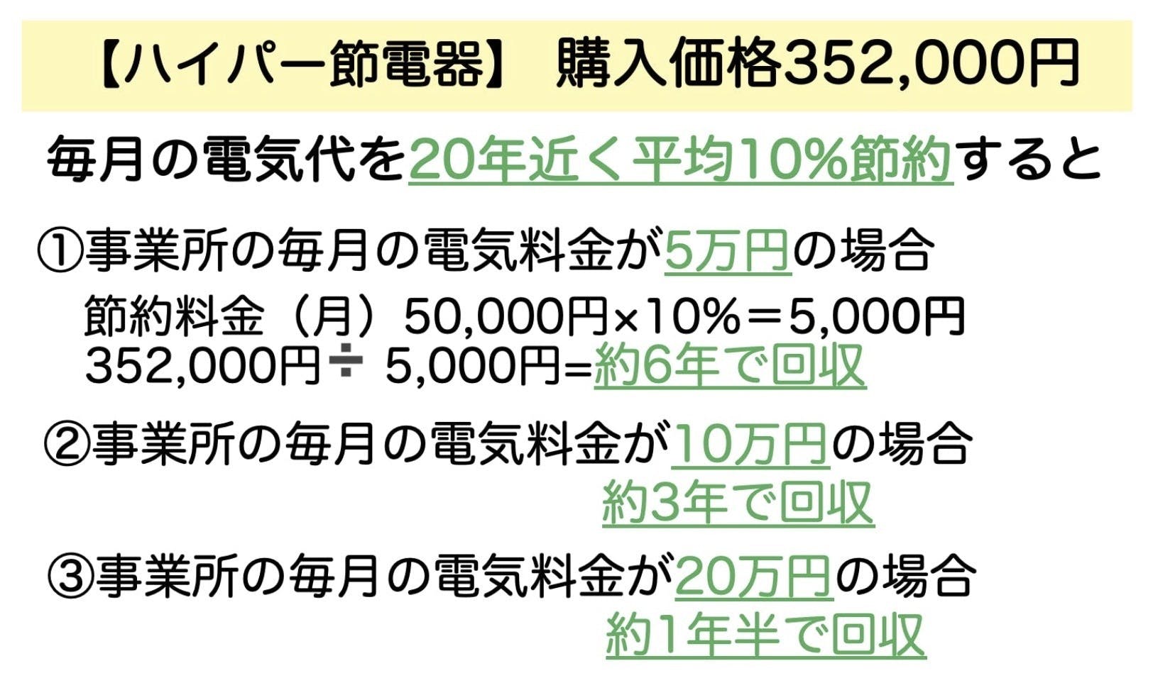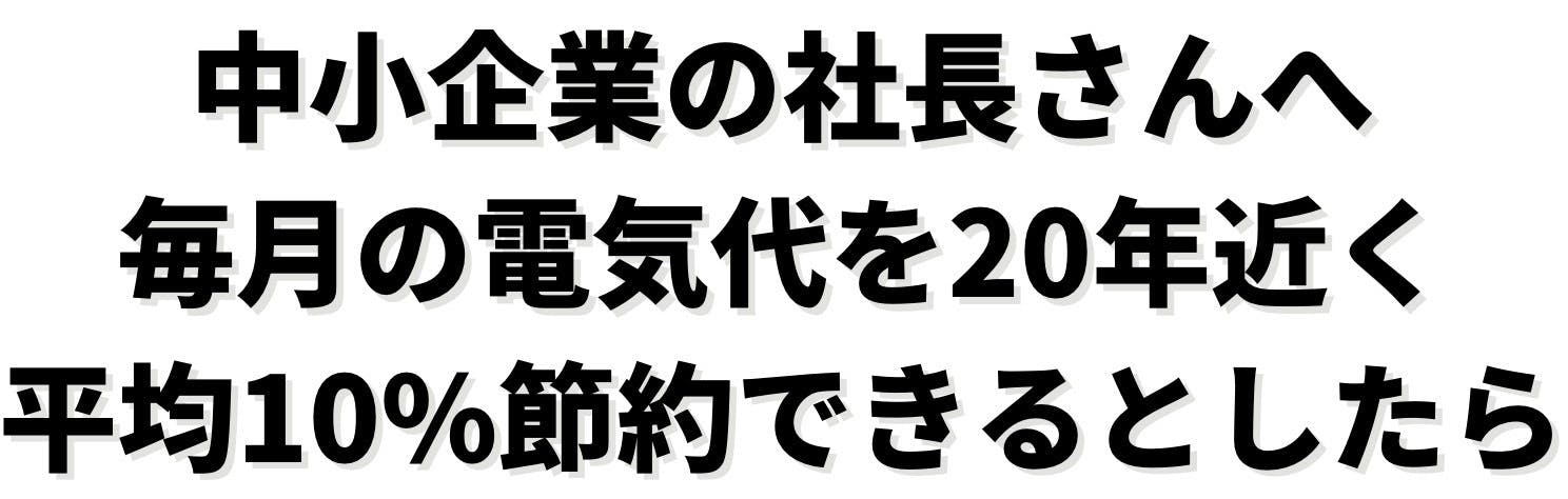 「高騰する電気代に倍返し!」ってどんな意味?【ハイパー節電器】は中小企業の社長さんのピンチを3つのチャンスに変えてくれます。毎月の電気代を20年近く平均10%節約できます。余分なCO2を削減でき、地球温暖化を遅らせることができます。この活動に誰もが喜んで参加したくなる流れもご用意しています。