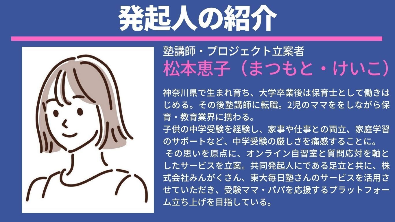 プロジェクトの共同発起人である足立さん、オンライン自習室サービスの「みんがく」さん、オンライン個別指導塾「東大毎日塾」さん、三者と私の思いである悩める中学受験ママ・パパを応援したい!その思いを実現させるための挑戦です!