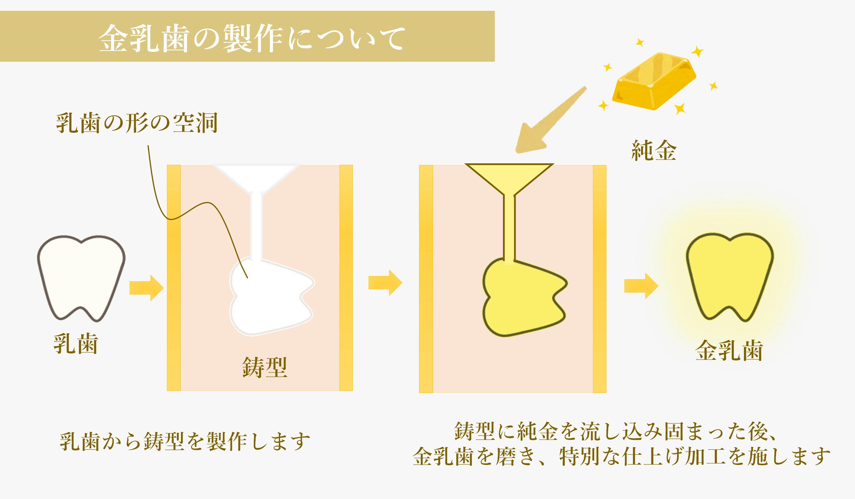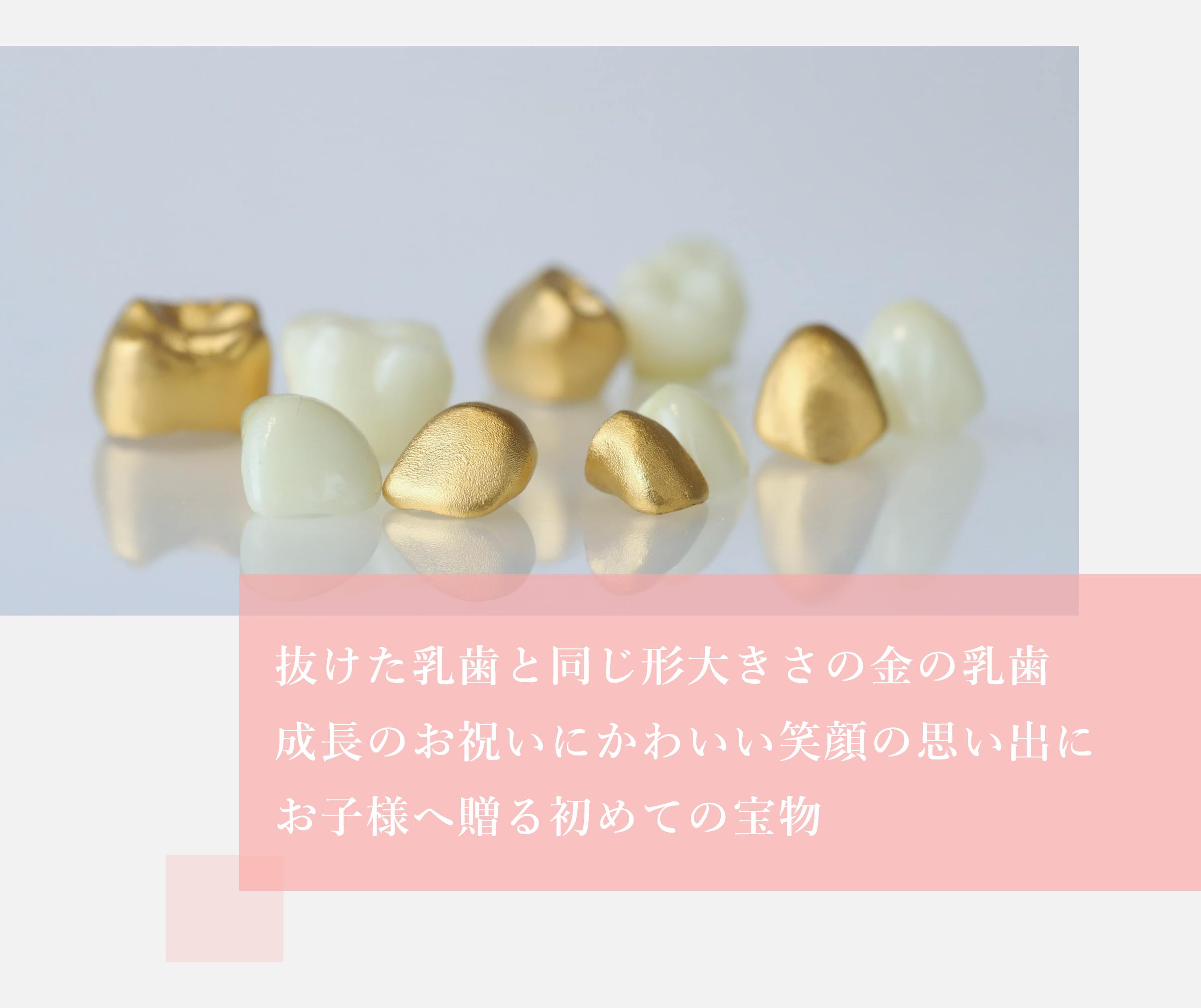 一生を共にする永久歯は、どんなきれいな宝石や高級なアクセサリーより大切なかけがえのないもの。金乳歯は、そんなメッセージを込めて、最初に抜けた乳歯をかたどった純金のオブジェをお子様へ贈ることをご提案いたします。それは、歯が純金と同じ宝物であることを伝えるのと同時に、日々成長されるお子様への愛を、永遠に色褪せない形として残すものでもあります。