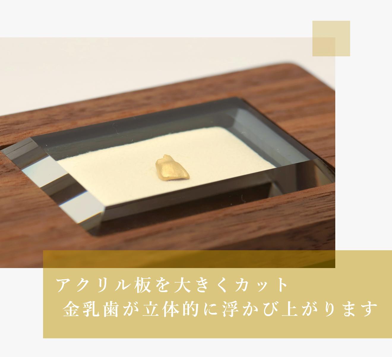 蓋を取ると、優しく輝く金乳歯が現れます。オブジェを固定するアクリル板を大きくカットしたことにより、立体的に見ていただくことができます。側面のアーチ状の切り込みから見える黒色の木目は、アクセントとして金乳歯を引き立たせてくれます。