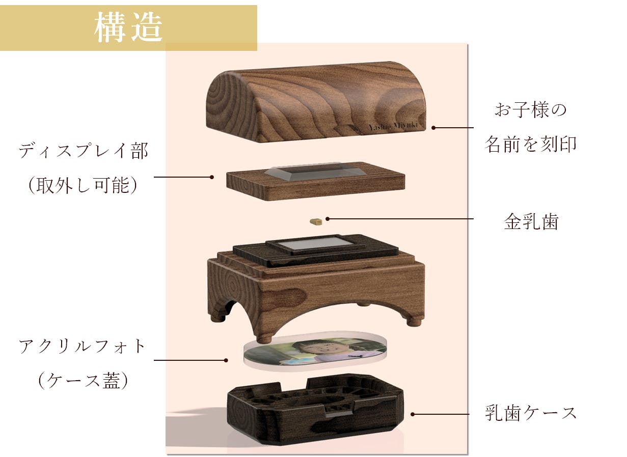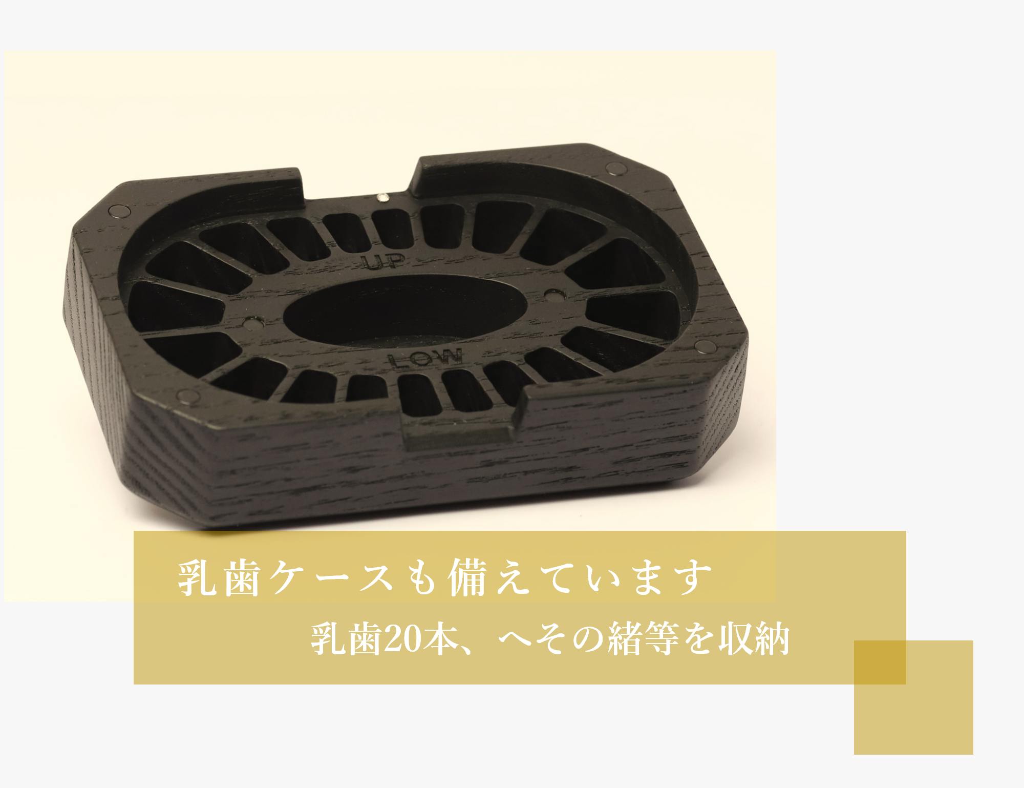 金乳歯をディスプレイする台座の下は、20本の抜けた乳歯を保管できる乳歯ケースとなっています。真ん中にはへその緒等を入れる空間を設けていますので、幼い頃の思い出を、まとめて残すことができます。