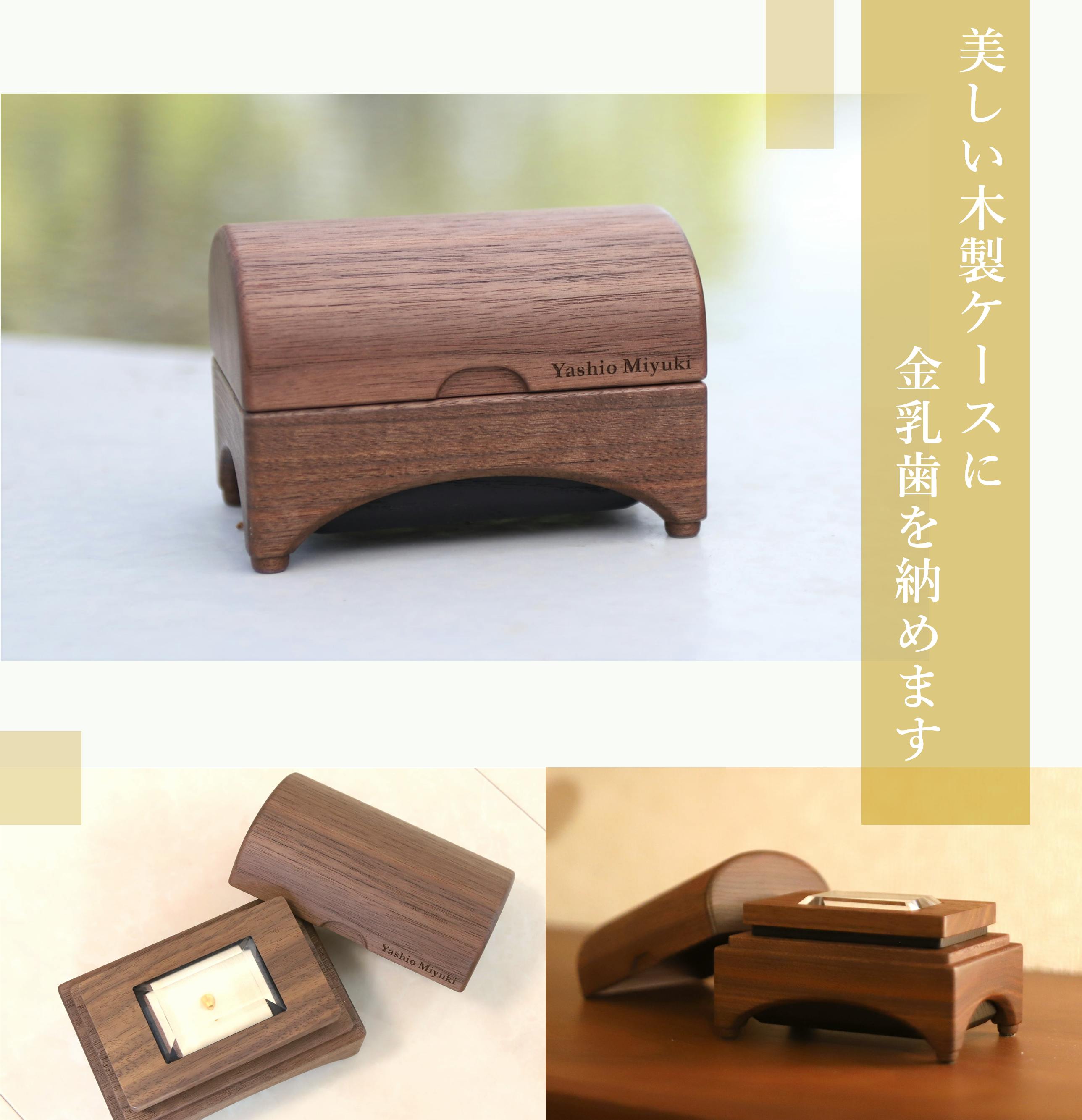 金乳歯は、お子様・お孫様の初めて抜けた乳歯を同じ形、大きさで精密に再現する純金製のオブジェです。本プロジェクトでは、そのオブジェを本物の乳歯20本も合わせて収納できるこだわりの木製ディスプレイケースに納めてお届けします。