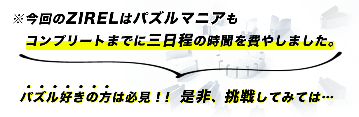 『何よりもまずシンプルかつおもしろい。遊び方を知るのに、時間をかける必要もない。ただ完成までの道のりは長丁場。シンプルでありながら、イライラしたり、興奮したり、切迫感も爽快感も味わえたり、何でもある。競い合って勝者が決まる。だから面白くて重要なことだ』ZIRELが2つあれば、家族、仲間同士、恋人同士スピードを争って罰ゲームありの飲み会も盛り上がるかもしれませんね(笑)