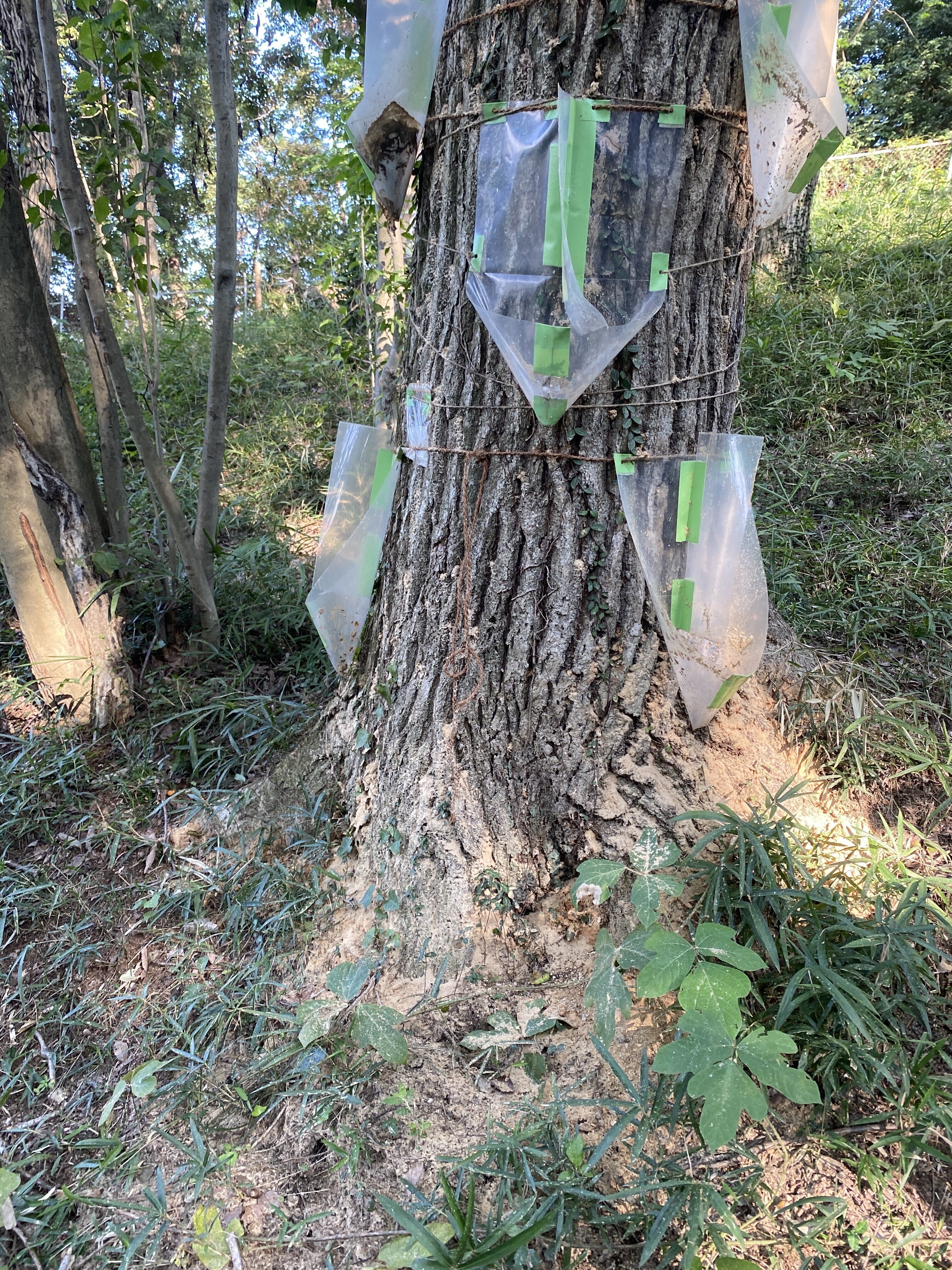 少しでも被害を食い止めるため、ボランティアの皆さんと守りたい木一本いっぽんに手作りのカシナガトラップを設置し、虫の侵入を防ぐカシナガ防除策を行なっています。