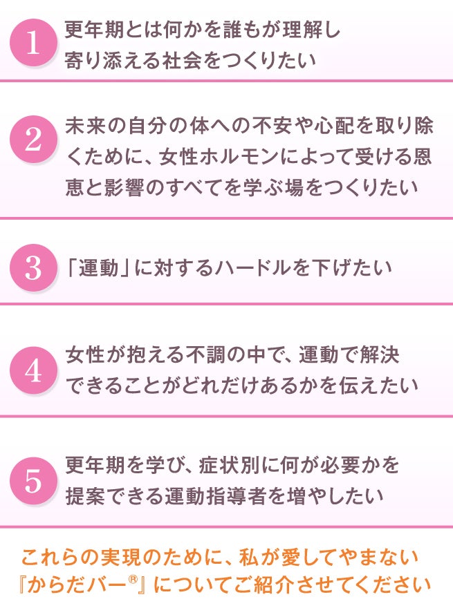 運動指導者として学んできた不調のメカニズムを、女性ホルモンの変調により起こる更年期症状と照らし合わせて、いま体に何が起こり何をするのがいいのかを提案していくことが、女性であり、母であり、運動指導者である私の責務だと感じました。