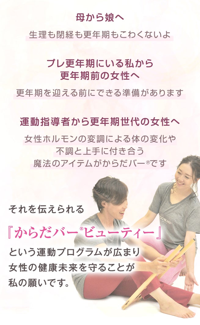 世の中のすべての女性が更年期を迎えることを怖がらずに、からだバー®ビューティーで不調を吹き飛ばす方法を手に入れ、快適に過ごせることを願っています。