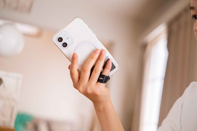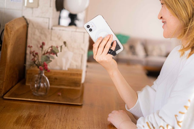SYANTOを取り付けると、大きくて重いスマホでも安定して持つことができるため、指の力を抜いて、より自由な角度でスマホを持つことができるようになります。
