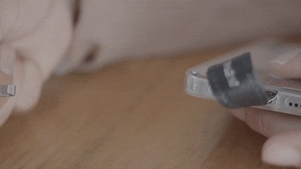 SYANTO i-ring は充電口からリングを出すデザインですが、0.5mmの極薄シートを採用しているため、ケーブルを使って充電する際も邪魔になることはありません。スマホケースが盛り上がってしまうこともないため、取り付けたことが原因でスマホが使いにくくなるようなことはありません。