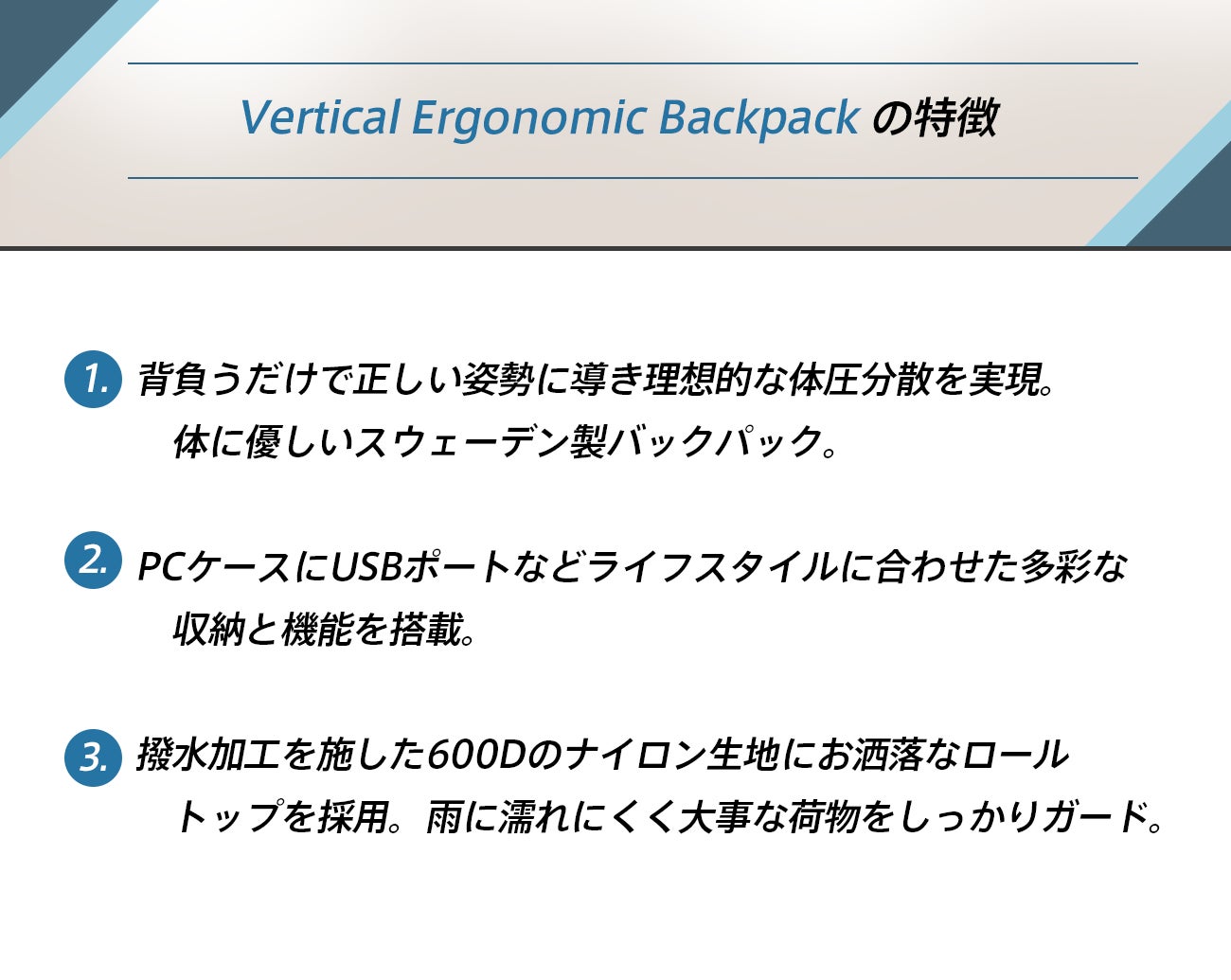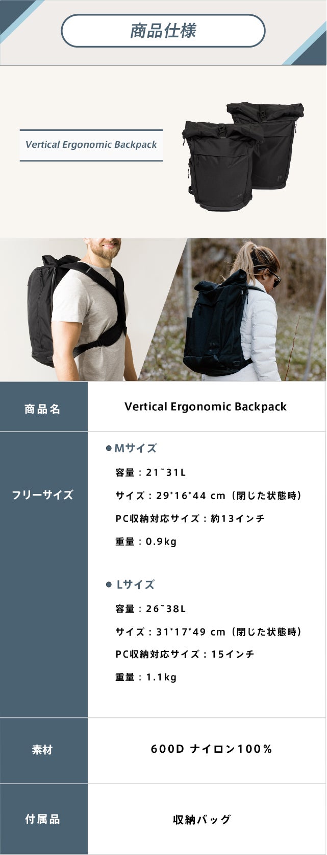 正しい姿勢に導く【Vertical Ergonomic Backpack】で移動を軽快に。