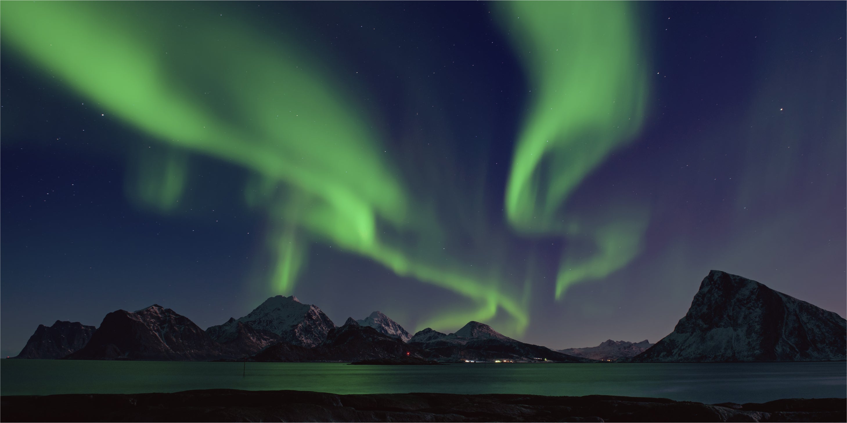 ↑まさにその名の通り、輝くオーロラの下に建つオーロラ スピリット蒸溜所の写真↑