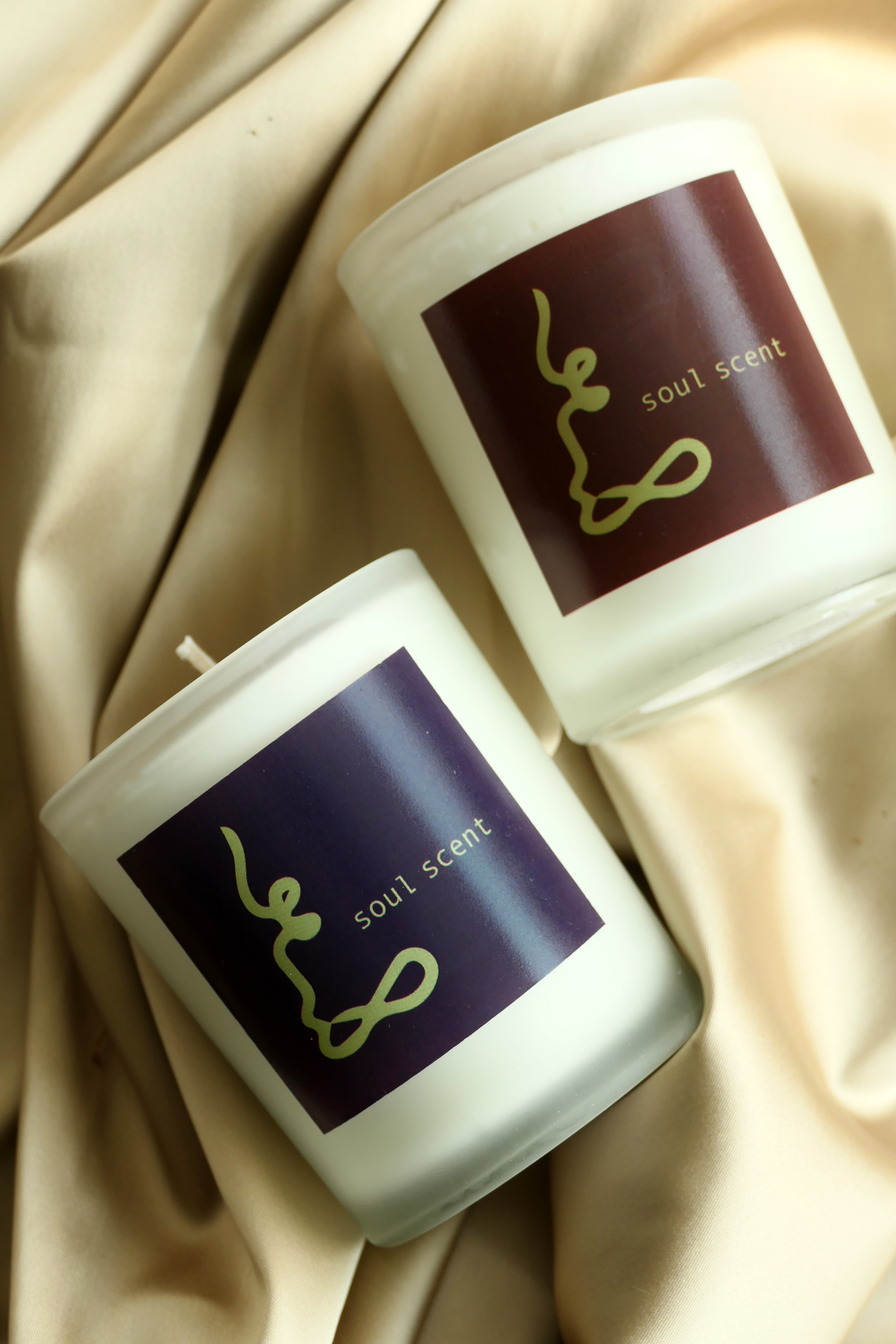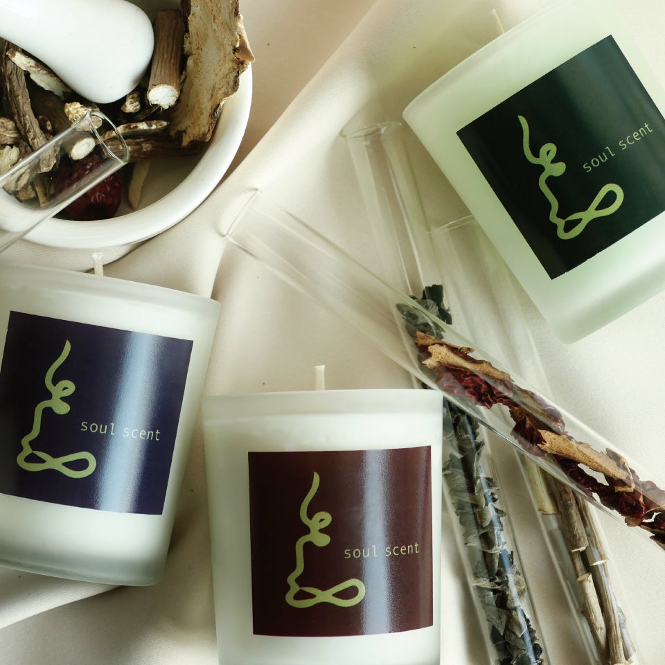 ①韓方(はんばん)キャンドル・・・何種類もの「韓方」が混ざりあった香ばしい香り。乾燥した韓方を36〜48時間煮出して最後の最後まで絞り出したエキスをオーガニックソイワックスに混ぜて作りました。