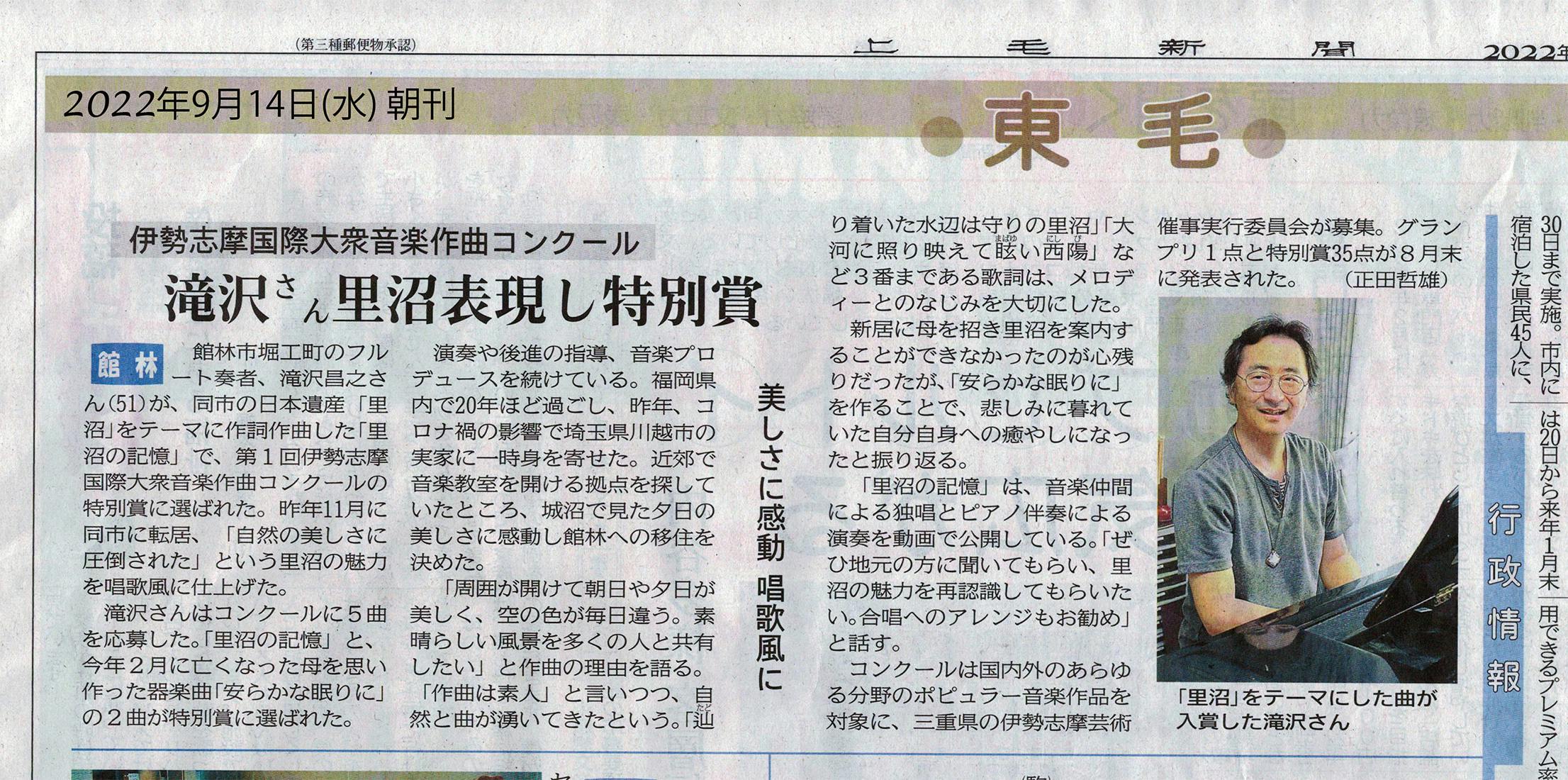 この入賞をきっかけにして、上毛新聞に掲載されたり、地元のケーブルTVで扱っていただいたり、教育長を表敬訪問させていただいたりしました。この作品の演奏依頼も数々いただくようになりました。(下記は上毛新聞と上毛新聞シャトルの記事)